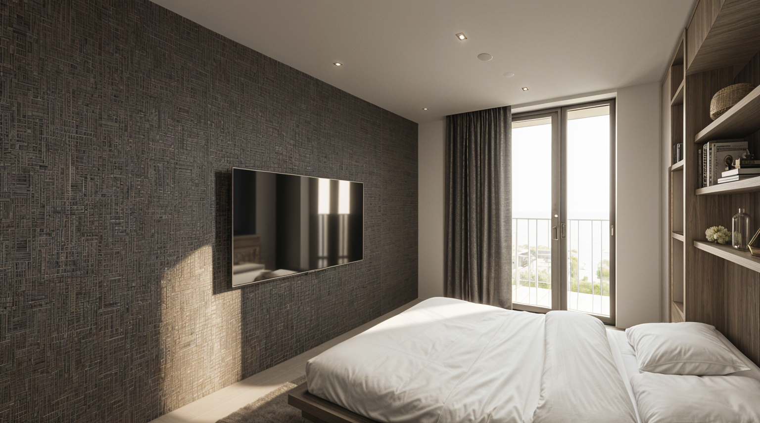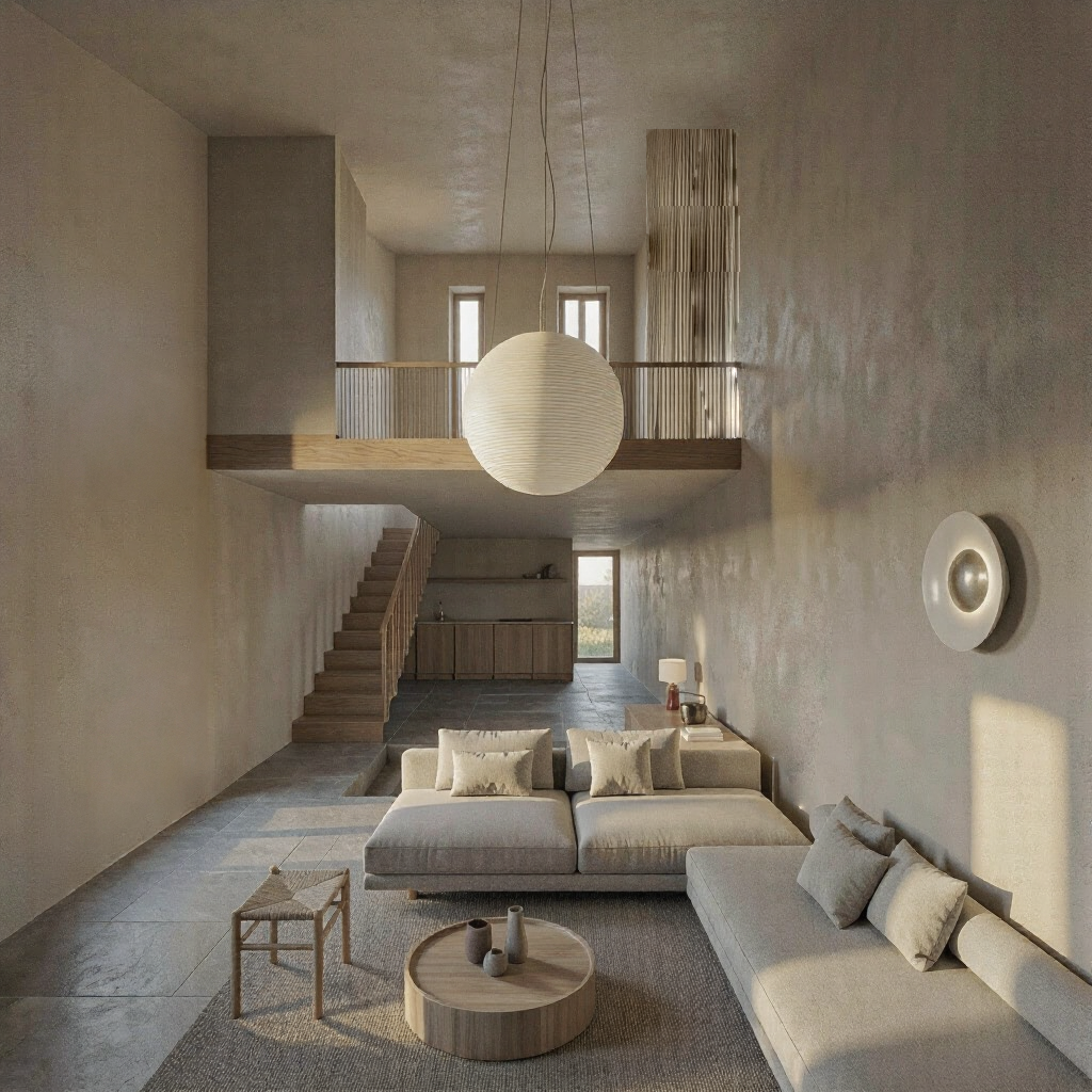 correct the lighting natural daylight only from the visible windows no hidden or artificial light sources accurate light direction and realistic shadow behavior soft natural bounce light between surfaces balanced exposure add a curtain dropping from the ceiling of the mezzanine level full height curtain from ceiling to mezzanine level lightweight natural fabric soft linen texture neutral off white tone subtle vertical folds minimal and architectural