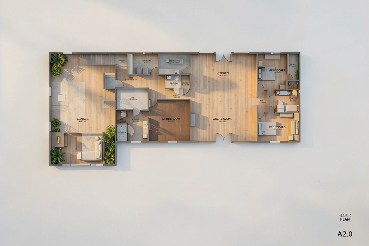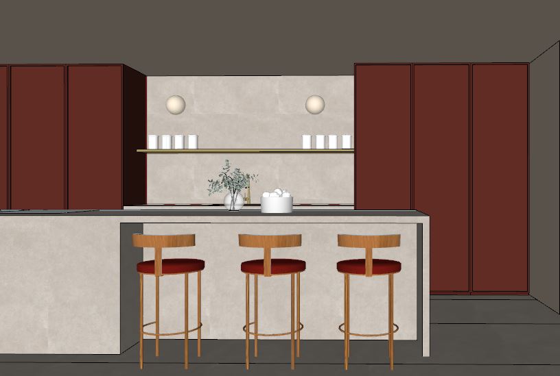ultra realistic architectural interior render editorial quality keep the exact composition camera angle proportions and layout of the original image do not reinterpret the design lighting add three ceiling spotlights aligned in a straight line parallel to the camera positioned above the island warm soft and realistic light emission with subtle shadows and no overexposure materials all beige surfaces island backsplash and walls must be large format porcelain approx 120x120 cm sand effect matte finish rectified pieces with almost invisible joints very subtle tonal variation and natural texture avoid flat or plastic look cabinets important maintain the current color but refine it into a deep burgundy granate lacquered finish slightly desaturated and elegant finish must be super matte or satin never glossy add very subtle imperfections and light absorption to avoid a plastic appearance wood elements enhance realism of stools structure and any wood natural walnut tone visible grain slight tonal variation completely matte no artificial repetition shelf and wall lights the shelf and the two wall sconces must be brushed gold soft metallic reflection warm tone not mirror like stools keep the exact design and proportions seats must be deep burgundy velvet granate matching the cabinetry rich tone soft texture slight compression and wear where used details and realism add micro imperfections slight edge wear subtle dirt accumulation in joints minimal irregularities in surfaces improve contact shadows and ambient occlusion avoid perfectly clean or synthetic look lighting atmosphere warm balanced slightly cinematic and editorial soft contrast delicate highlights no harsh glare final look highly photorealistic high end editorial interior photography tactile materials natural imperfections believable light and depth no cgi or artificial appearance