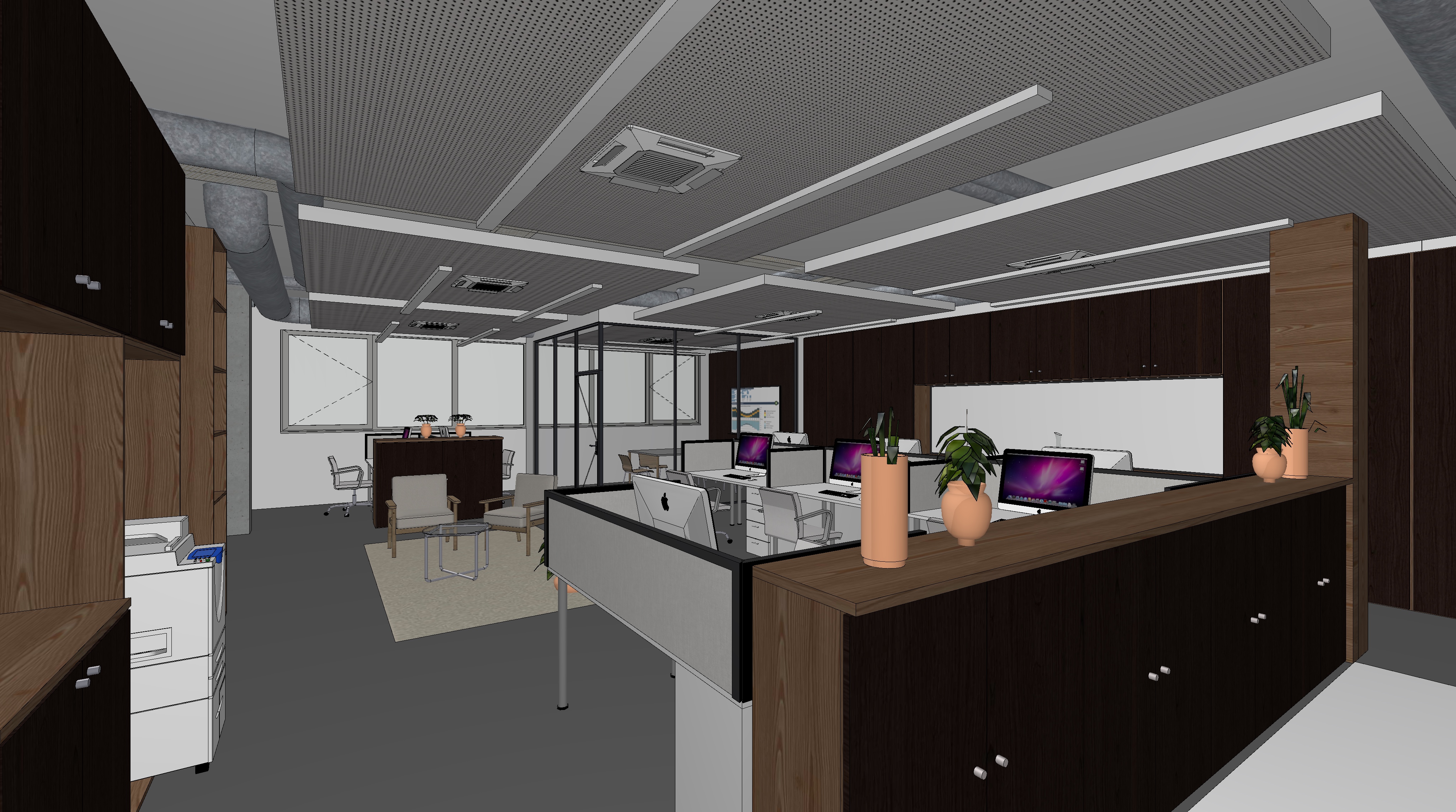 professional photorealistic office interior rendering modern open space workplace with dark walnut wood furniture and light wood accents perforated white plasterboard suspended ceiling suspended linear led lights with visible hanging cables exposed hvac ducts industrial style glass walled meeting rooms imac workstations cozy waiting area with beige armchairs potted plants in terracota pots dark gray matte epoxy resin flooring bright and clear atmosphere high key lighting abundant natural daylight from large windows architectural visualization high end corporate office design ultra detailed 8k resolution photorealistic materials realistic shadows and reflections professional interior photography style depth of field ambient occlusion global illumination