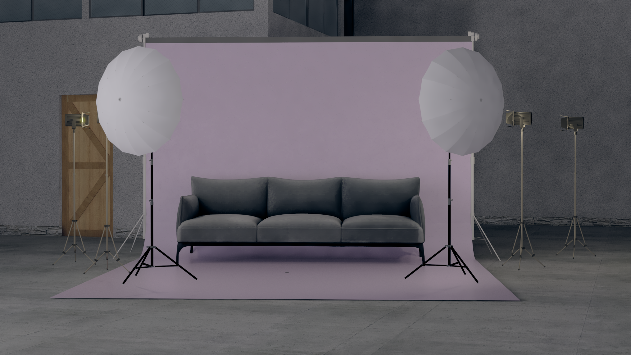 cinematic light with fog a ll the walls in gray the floor is of concrete all are cinema reflector