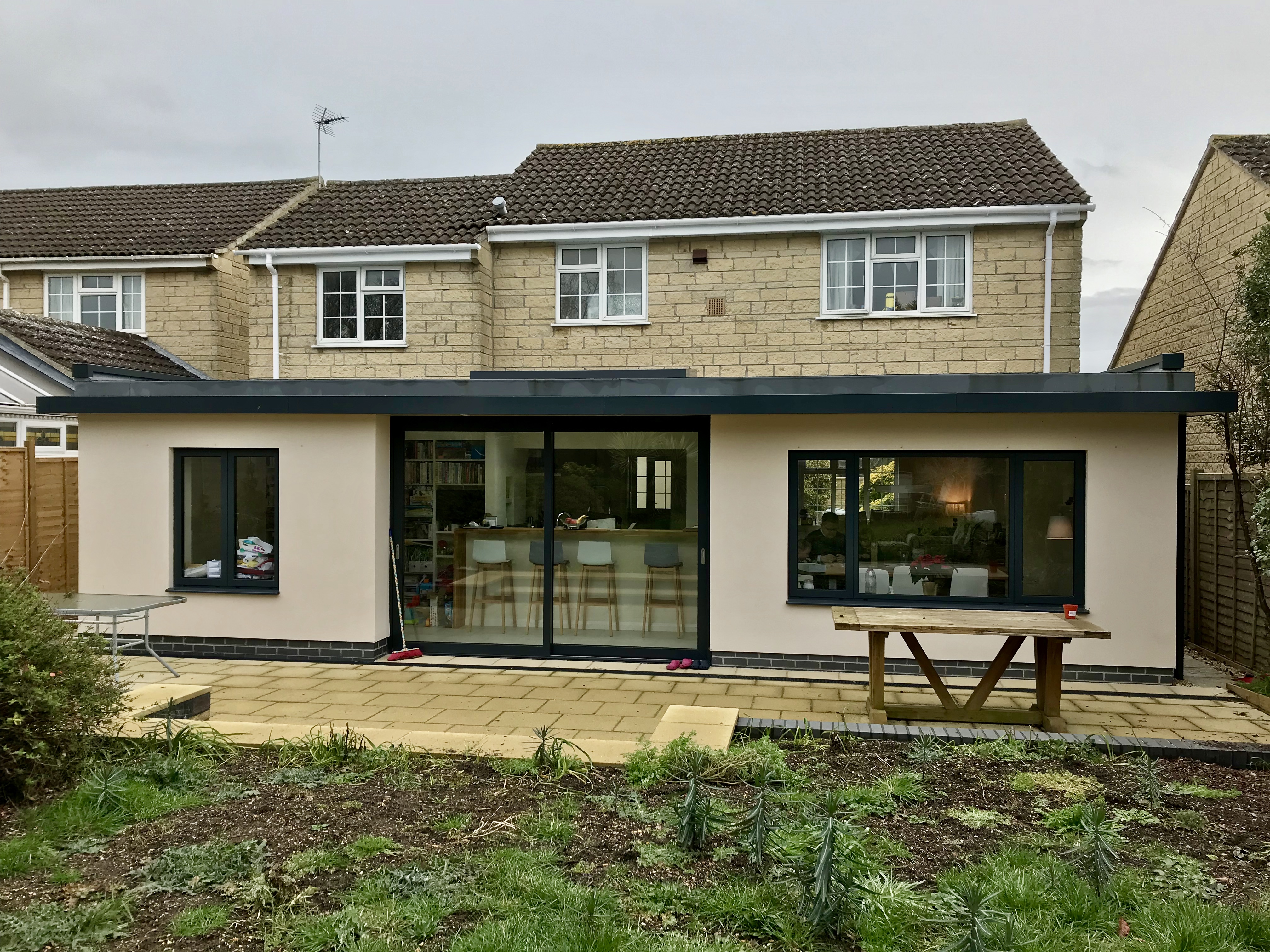 upper lawn with shrubs steps down to stone paved terrace