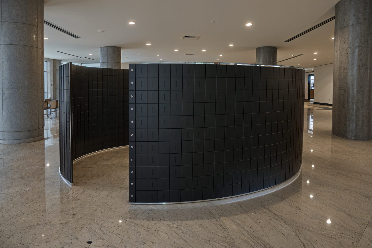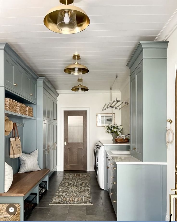 use these sample images to render a walk through laundry room with a dropzone with the following details there should be an exterior door at the end of the room the floor should be checkerboard gray and white marble look tile the washer dryer sink should be on the left side of the room with upper cabinets above them the dropzone should be on the right side of the room with mostly closed locker storage and open cubbies at the top and bottom of the unit the cabinets should all be a mid tone grayish blue and all of the walls trim should be the same color brass decorative lighting on the ceiling and brass hardware