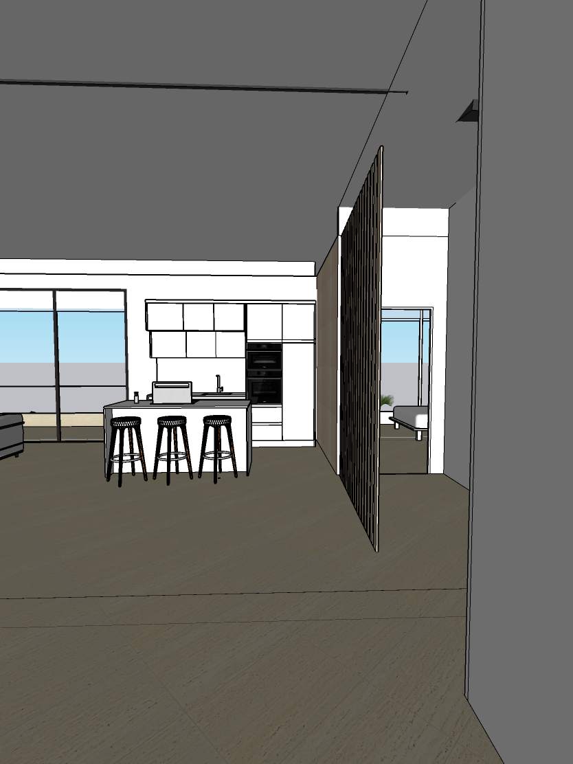 interior shot interior modern kitchen and living space featuring sleek white cabinets with brushed stainless steel accents countertops are a light gray quartz with three barstools in front the flooring is travertine shiny large tile square tiles walls are painted in a soft white large floor to ceiling windows showcase a clear blue sky and a tropical ocean view add an airy minimalist boho atmosphere with natural light flooding the space enhancing the clean contemporary design