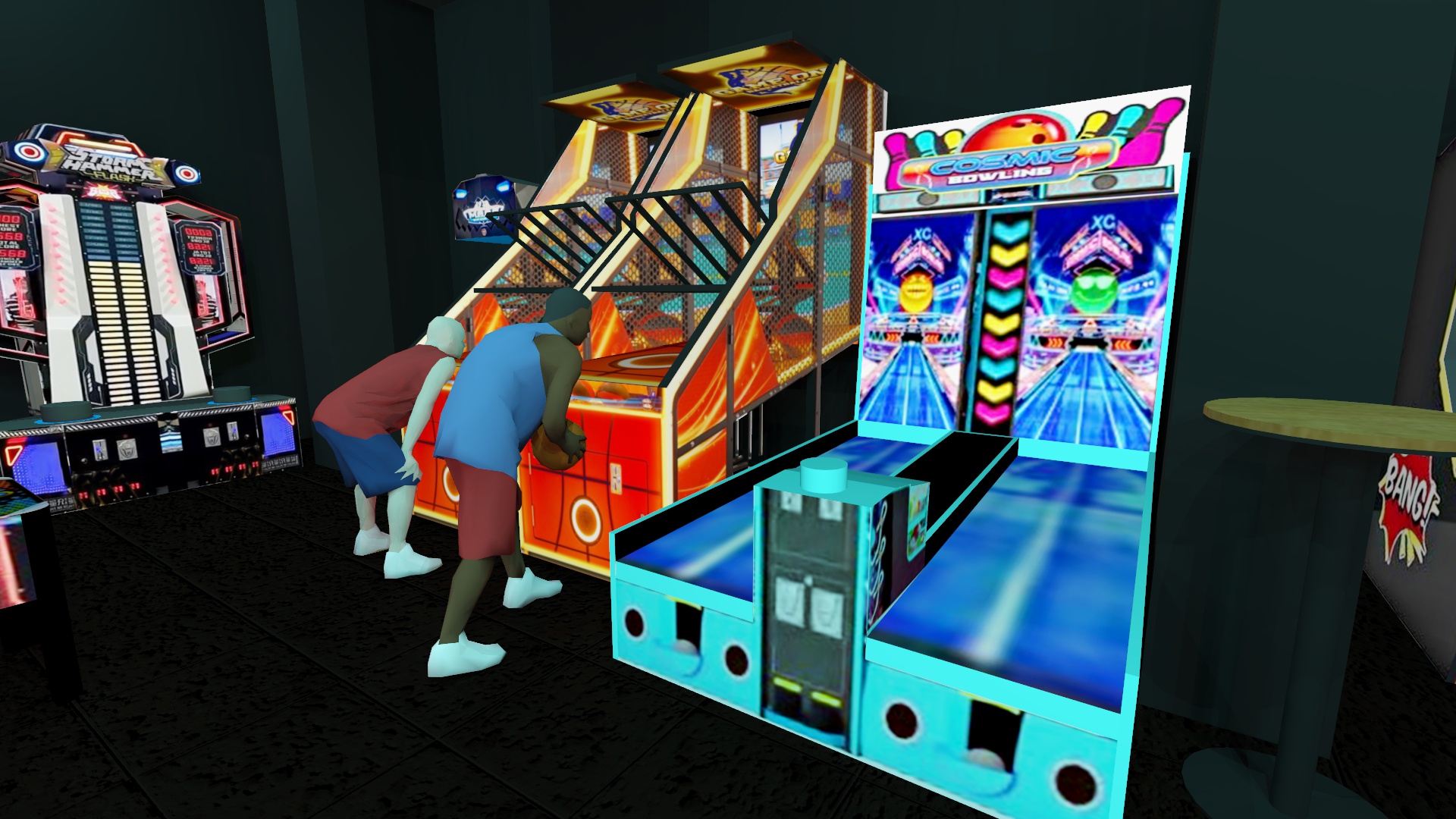 an arcade and gaming hall the machines glow brightly black walls and a black ceiling the floor is covered in dark carpet turquoise light lines line the ceiling and turquoise lighting under the furniture make the image photorealistic