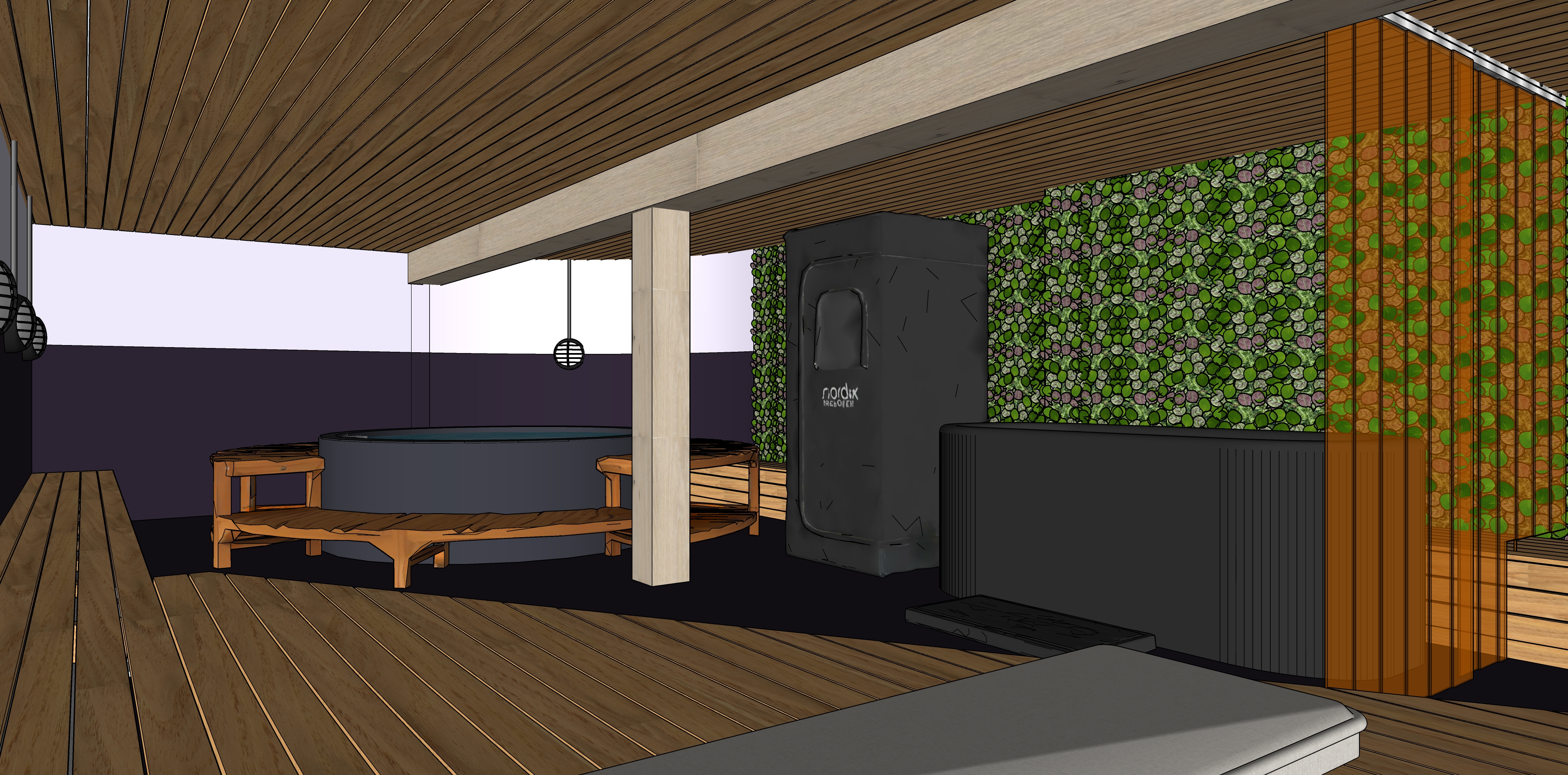 do not change the colors materials finish keep the viewing angle turn on the wall lights it is a basement without windows but still bright ambiance with dim lighting the floor is painted dark purple concrete the bottom of the dry walls are dark purple but the top of the walls is white with a very little tint of lavender colored the curtain is made of frosted amber plastic slats the ceiling and the benches are made of wood dried construction spruce light wood lumber the cushions on the benches are made of linen the structure around the spa is made of wooden slats the exterior of the spa is a dark gray make a light under the wood bench create a little smoke coming from the spa