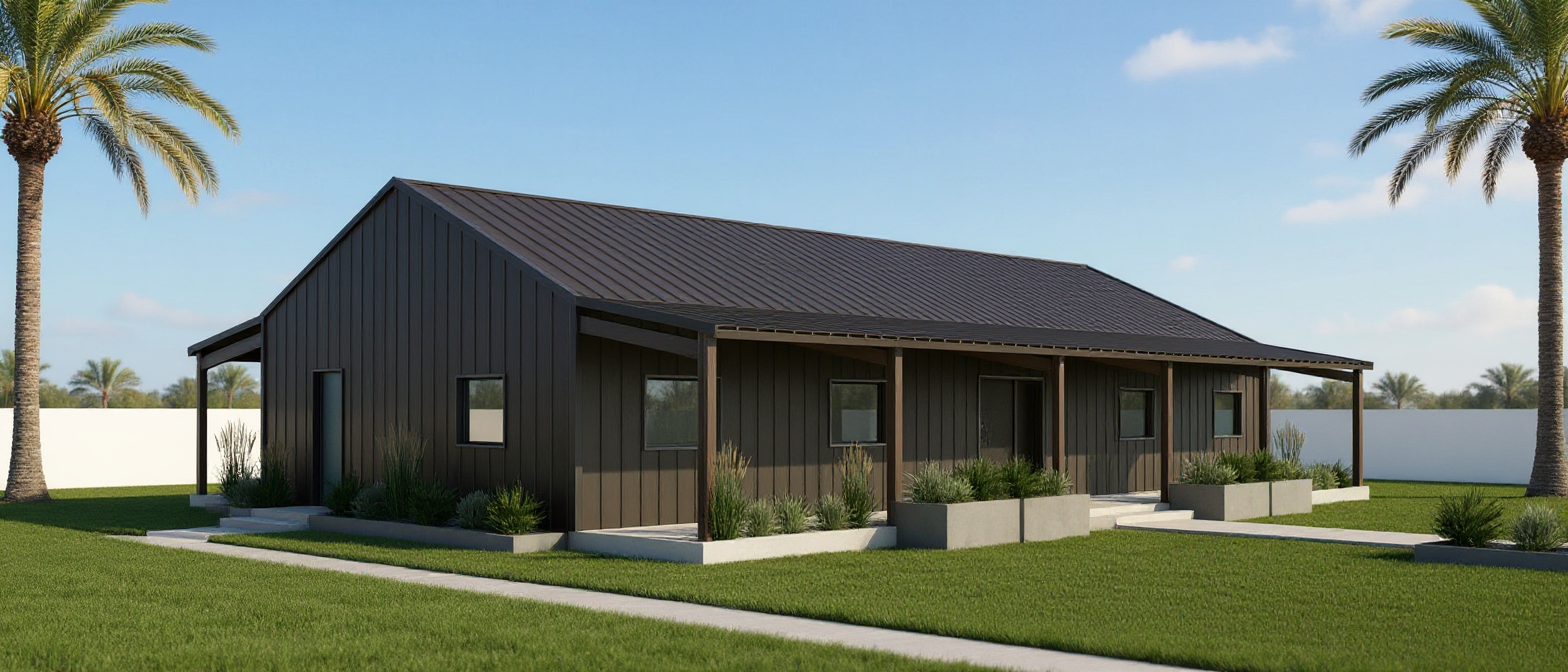 generate an ultra photorealistic physically accurate 3d architectural rendering of a real buildable barndominium do not stylize do not illustrate do not cartoonize model the structure as if produced in revit sketchup blender with cycles or v ray using real world construction dimensions walls roof thickness trims doors windows and overhangs must be true to scale with crisp edges and realistic joins materials pbr only exposed fastener metal siding with subtle oil canning micro scratches and varied reflectivity matte metal roofing with realistic seams real glass with accurate reflections and refraction no flat colors no plastic surfaces lighting critical natural florida daylight high sun angle strong but realistic contrast physically correct shadows no glow no bloom no soft cgi lighting use real sky illumination hdri style environment florida setting with real vegetation scale palms scrub grass sandy soil flat terrain no fantasy landscaping no painted backgrounds slight atmospheric haze only camera architectural photography perspective 28 35mm lens straight verticals no distortion tripod level framing style target indistinguishable from a real photograph of a completed home