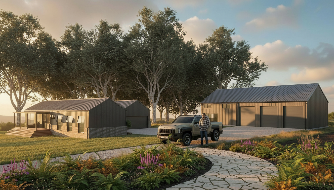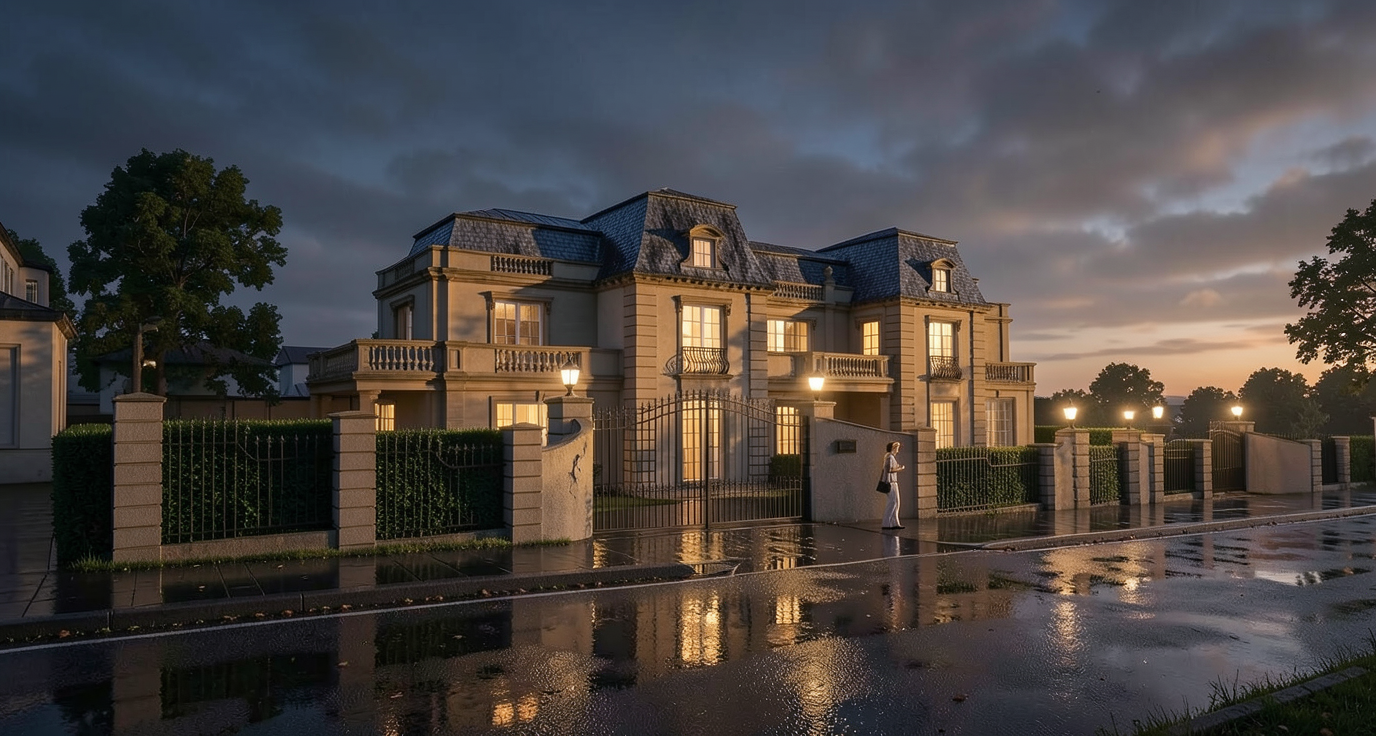 photo realistic render classical home high green hedges fence dramatic lighting award winning at dusk contrast wet slate roofing wet road pedestrian gate with two vehiecular gates on the side