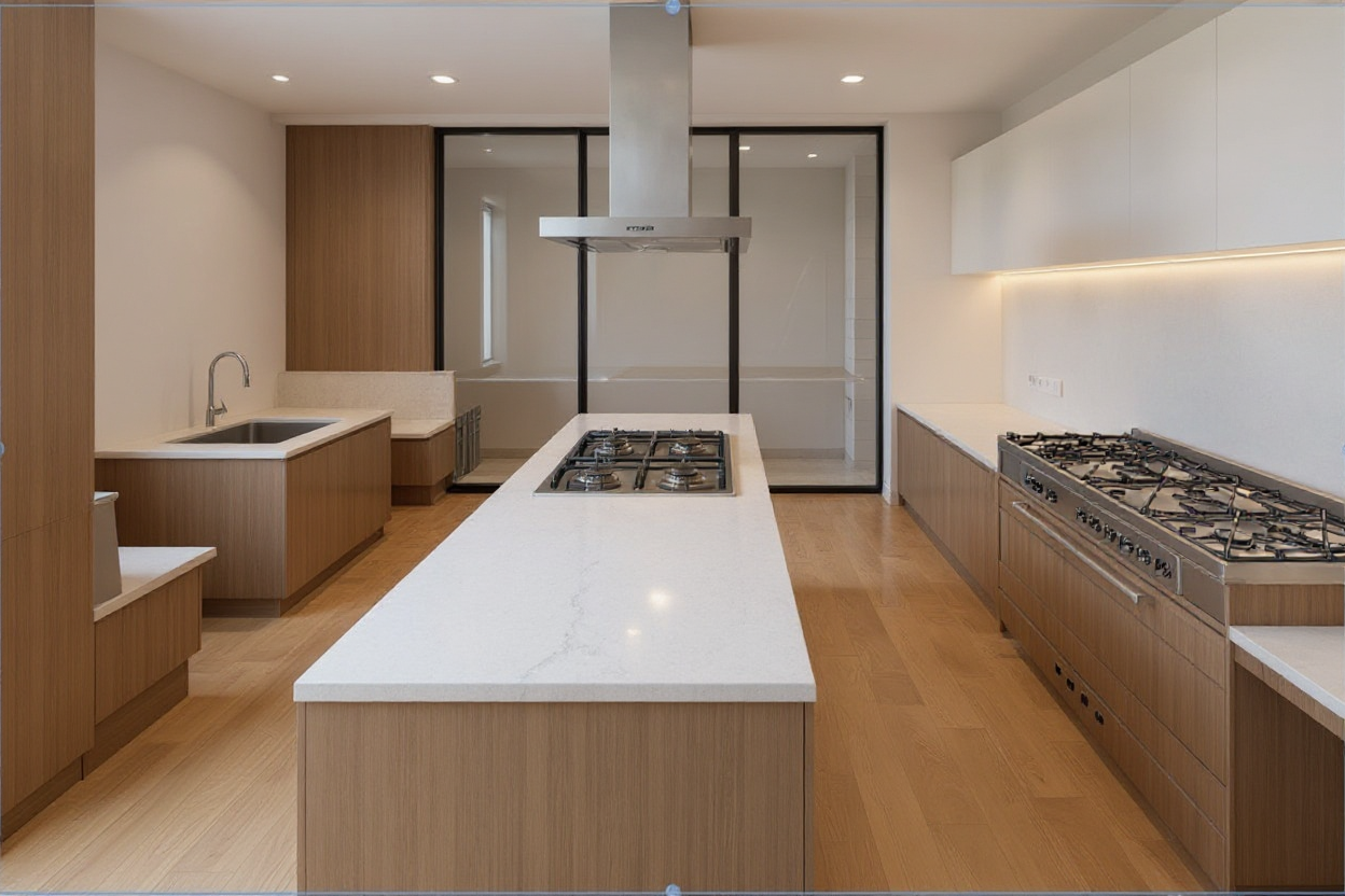using attached drawing to render the kitchen add hood on top of range no sinks white wall lighter wood tone waterfall at short side of island go back to previous show outdoor at glass go back to previous use this rending take out sink show out door space at the far end glass door no range at middle island remove island hood