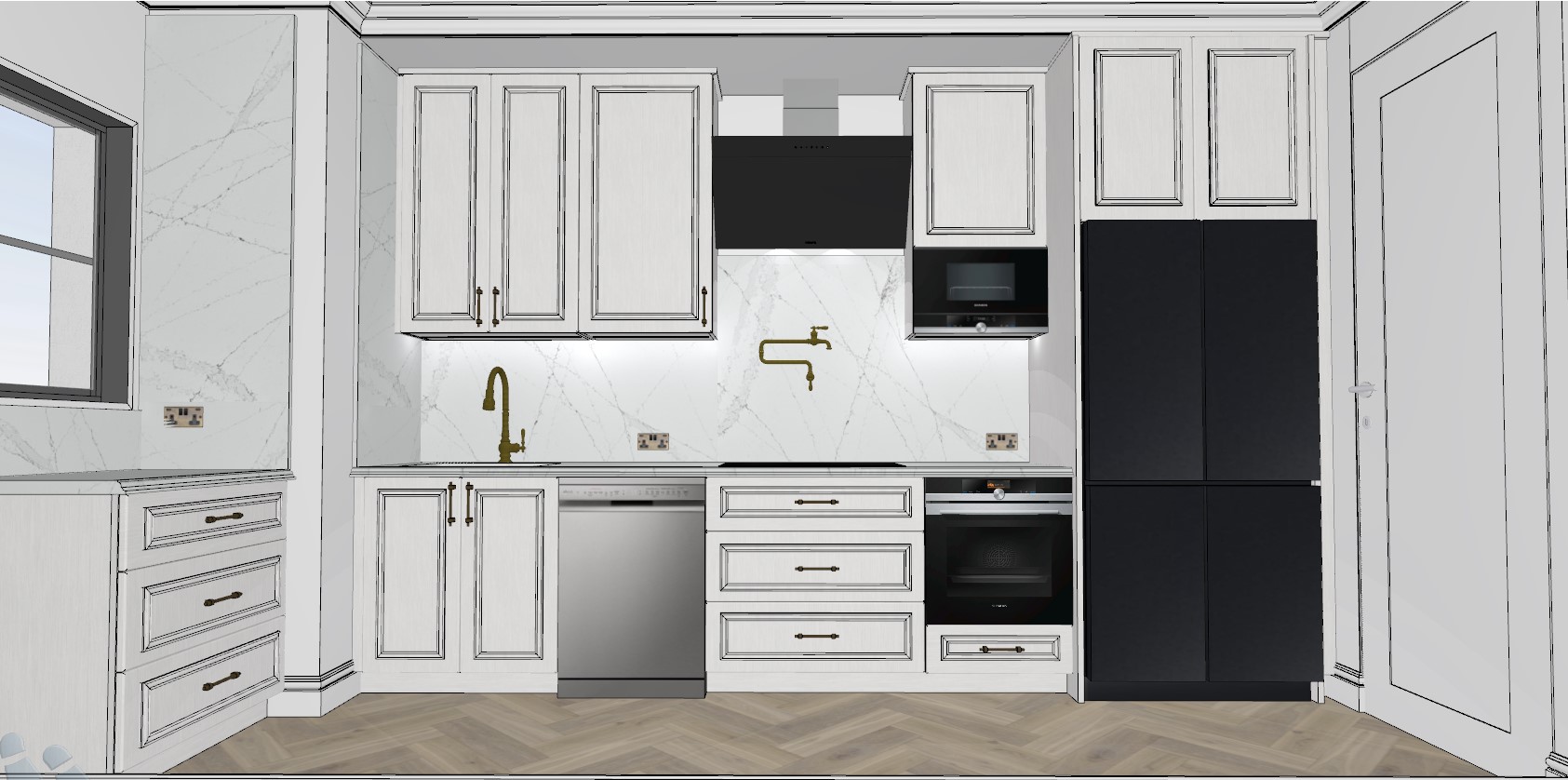 render a modern kitchen with a luxurious and bright atmosphere include white cabinets with elegant paneling featuring dark bronze handles design a marble backsplash with subtle gray veins incorporate stainless steel appliances for a sleek look add a gold tone faucet for a touch of opulence paint the refrigerator panels matte black for contrast use light wood herringbone flooring to add warmth and texture ensure abundant natural light streams through a large window for an inviting atmosphere