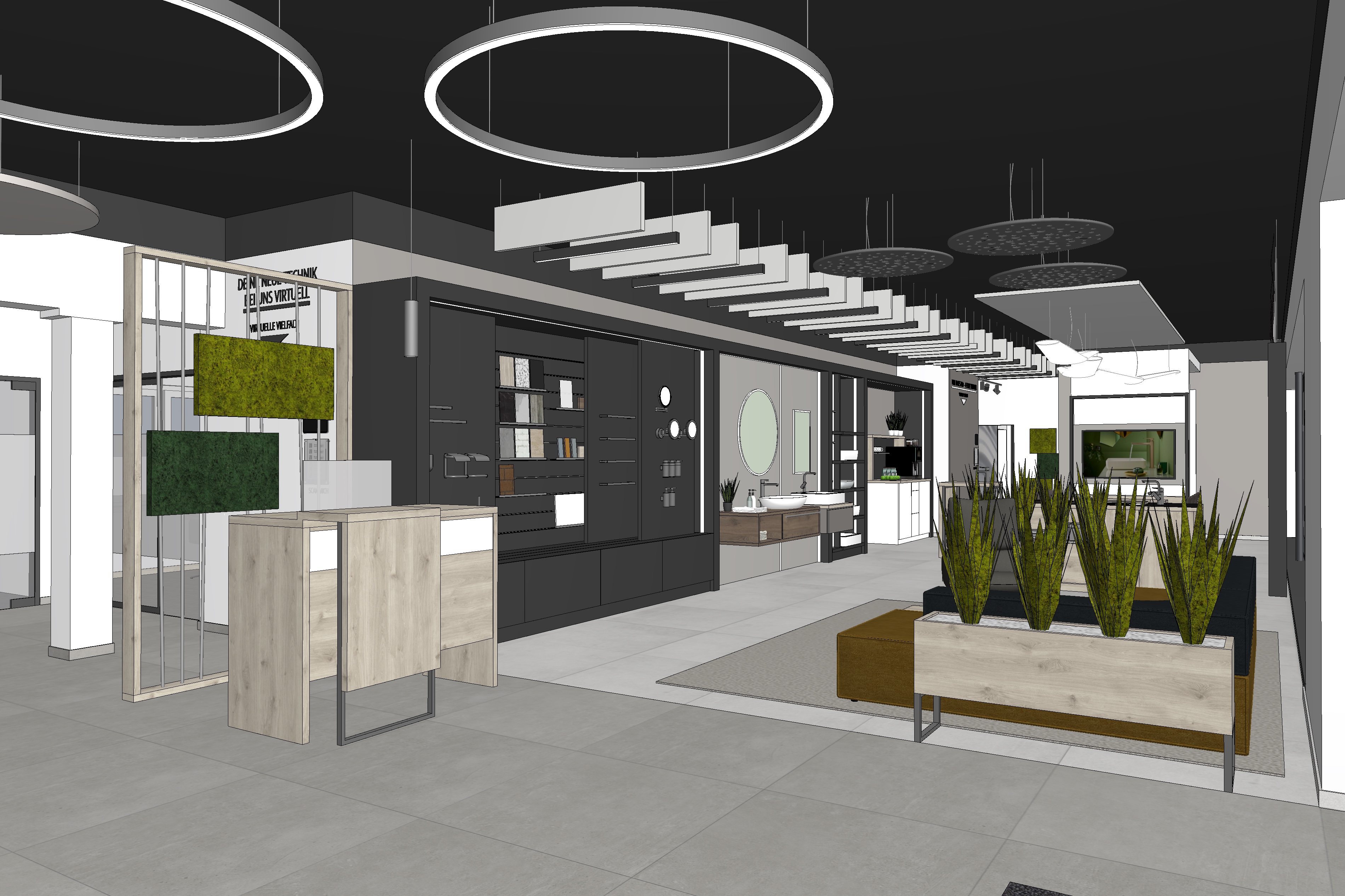render a modern sophisticated interior space featuring minimalist design with a calming atmosphere use a monochromatic color scheme with sleek black and soft gray tones for walls and ceilings incorporate a light wood texture for furniture surfaces adding warmth enhance greenery with deep green plants for contrast include luminous white pendant lights hanging from the ceiling to create a gentle glow the flooring should be a light gray polished concrete adding to the contemporary aesthetic with the entire scene bathed in gentle natural lighting for a serene ambiance