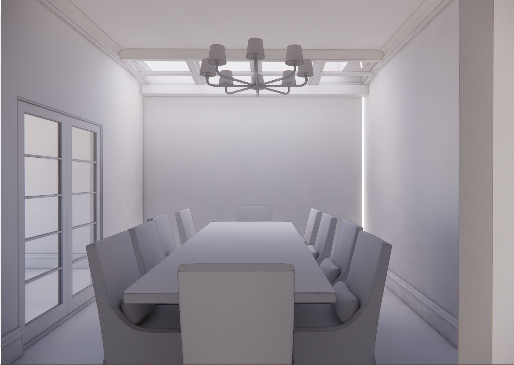 render a contemporary interior scene with the following specifications chairs upholstered in light beige fabric featuring very subtle thin beige stripes tone on tone low contrast walls finished in a half height rubble porte paint treatment lower half textured rubble style finish upper half smooth painted surface in a complementary neutral tone a timber door positioned on the left side of the room with a natural wood finish and visible grain flooring in timber parquetry laid in a checkerboard pattern alternating wood tones for contrast use soft natural lighting to enhance material textures and ensure realistic fabric timber grain and surface detailing aim for a warm refined atmosphere with high material realism and balanced composition
