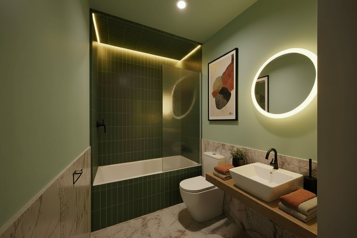 modern compact bathroom interior same layout as reference image bathtub with glass screen on left wall mounted toilet floating wooden vanity with rectangular vessel sink round backlit mirror recessed ceiling with indirect led strip lighting above shower area replace all green tiles with warm rust terracotta glossy ceramic tiles vertical layout high variation v3 v4 slightly handmade texture replace painted walls with soft warm beige light clay tone complementary to rust tiles keep marble elements in light beige travertine style finish with subtle veining maintain wooden vanity in natural oak finish black matte fixtures tap shower accessories lighting warm white 3000k soft indirect led glow in ceiling recess and mirror style modern mediterranean warm cozy boutique hotel aesthetic materials glossy ceramic tiles matte painted walls natural wood light marble camera eye level 24 28mm lens realistic proportions render ultra realistic soft shadows high detail natural light balance