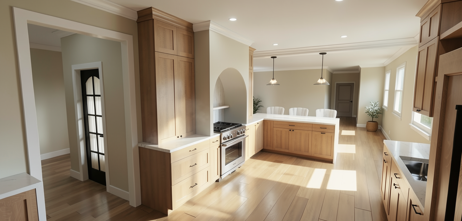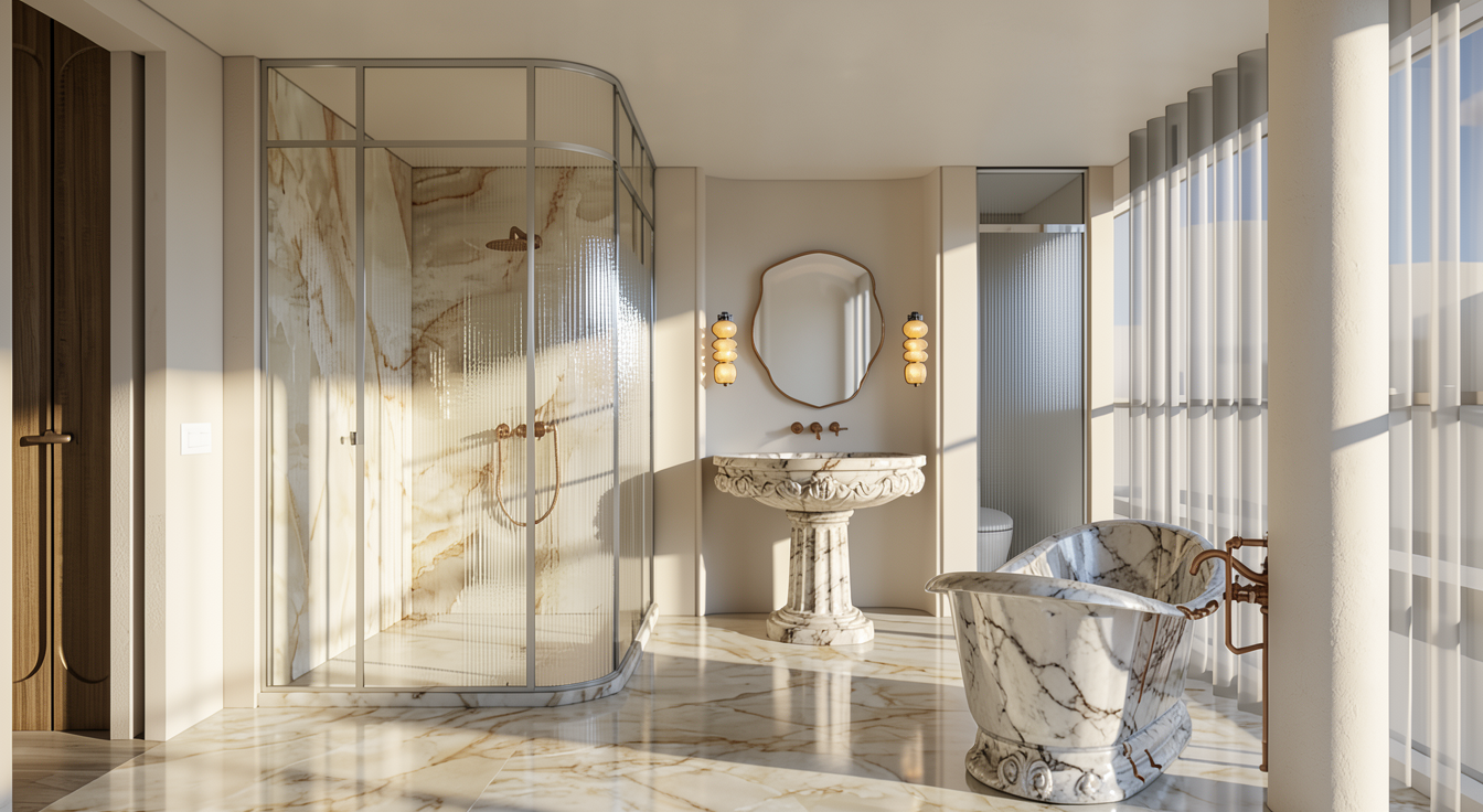 create realistic balanced bathroom lighting while strictly preserving the original geometry composition and camera angle do not modify add remove or reshape any architectural elements or objects the bathroom walls are finished with natural delicate beige plaster lighting should gently reveal subtle surface texture soft tonal variations and a matte mineral character with no harsh shadows or exaggerated contrast the floor is finished with dark natural stone in an irregular pattern strictly preserve the original floor pattern and layout do not simplify regularize repeat or alter the irregular stone arrangement maintain the exact stone sizes shapes joints and pattern distribution the floor must appear matte and non reflective with low gloss soft light absorption and no visible shine polish or wet surface effects the surface behind the toilet is made of natural stone rendered with physically accurate properties realistic material weight fine surface irregularities subdued reflections and natural color depth the toilet flush button is made of the same natural stone as the wall behind the toilet it is integrated flush with the surface with only a subtle outline visible no contrast gloss or separate material should be introduced the button should remain minimal and discreet use soft neutral artificial lighting appropriate for a bathroom environment light should be evenly distributed calm and functional avoiding dramatic contrast glare or cinematic lighting effects improve the overhead ceiling lighting to achieve smooth even illumination across all surfaces eliminate visible light cutoffs hard edges or artificial falloff on the walls avoid any visible v ray plane light edges or clipping on the walls or ceiling light transitions must be smooth and natural with continuous light spread and realistic bounce as in a real interior space the wall mounted radiator is charleston by zehnder finished in stainless steel the material should be rendered with realistic brushed metal properties subtle reflections correct roughness soft light response and no excessive shine or mirror like reflections the trash bin and toilet brush are finished in stainless steel matching the radiator in tone and material quality render them with consistent brushed metal properties subdued reflections correct roughness and no mirror like shine or chromed appearance enhance global illumination soft shadows ambient occlusion and natural color balance the final result should resemble a high end calm photorealistic bathroom interior with a refined natural atmosphere