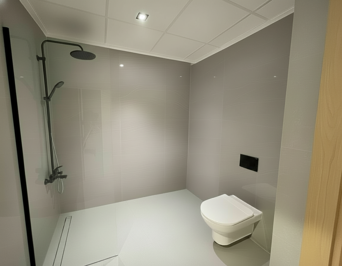 coloca el mueble y el lavabo de la im gen de referencia en la pared de la esquina inferior izquierda que llegue contra la mampara
