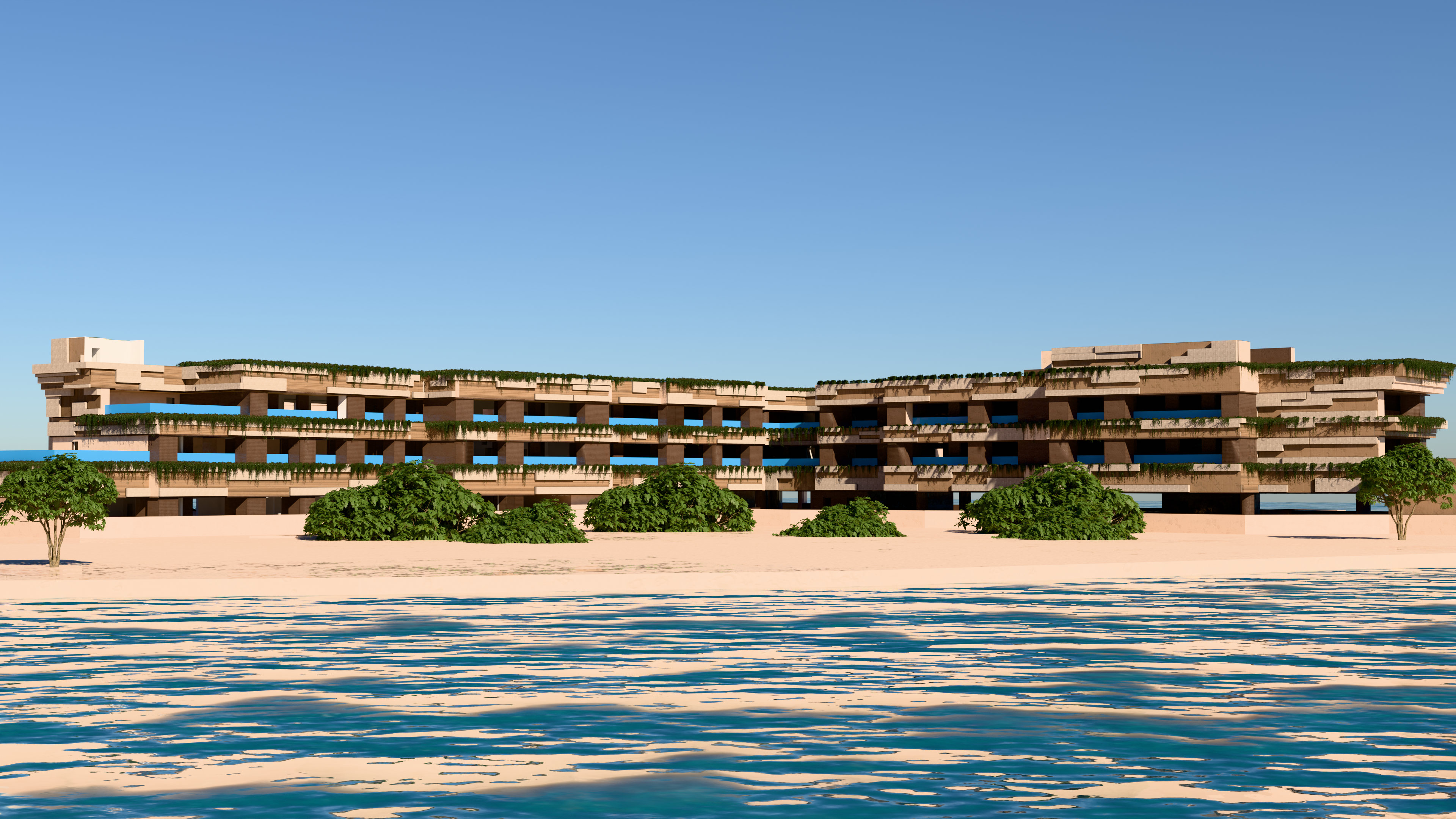 transform this architectural render into a conceptual hand drawn sketch preserve the differentiation of colors and textures but render them as flat pantone style marker fills with subtle variations as if applied by hand outlines should be done with loose pencil or ink lines slightly irregular with quick hatching for shading keep architectural details visible but soften precision so the result feels like an authentic hand sketch using pantone markers on tracing paper freestyle mode