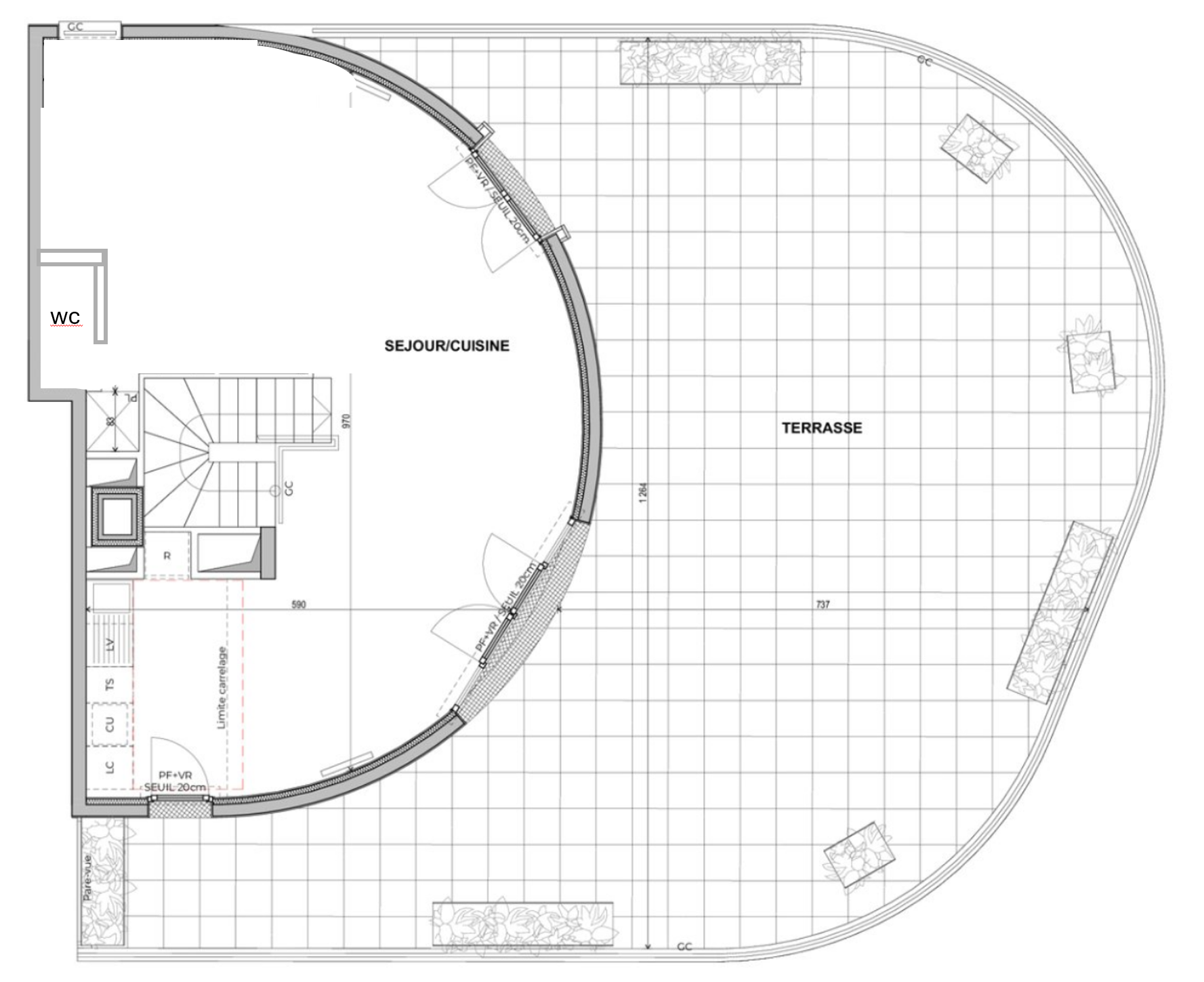 convert this floor plan into a realistic isometric 3d view of a full house show the space from an elevated angle with furniture walls and details visible global flooring living areas circulation polished waxed concrete floors throughout all main living spaces palette warm beige grey tones smooth matte finish with subtle light reflections seamless transitions between rooms bathroom sdb master suite grade italian walk in shower with frameless floor to ceiling glass panel rainfall ceiling showerhead freestanding sculptural bathtub organic form matte stone finish double sink vanity with stone countertop wall mounted faucets integrated under mirror lighting floor walls large format beige porcelain stoneware tiles honed finish tight grout lines mediterranean warmth with contemporary precision dressing room full perimeter built in closets flush panel doors floor to ceiling height integrated handles open central circulation axis warm beige lacquered or natural wood finish coherent with the global mediterranean palette home office bureau dedicated working office setup structured desk with integrated computer workstation ergonomic layout built in shelving or cabinetry ambient and task lighting layered materials echoing waxed concrete and warm wood tones of the main spaces wc laundry room interior living dining open kitchen flooring seamless waxed concrete throughout warm beige grey tone matte polished finish no transitions between zones the flooring flows continuously from entry through living dining and kitchen areas living area low profile mediterranean seating deep linen or boucl sofas in warm sand tones aged brass or travertine coffee table subtle arched architectural details echoing the curved fa ade geometry ambient layered lighting recessed ceiling spots pendant warm light over dining dining area large raw stone or solid wood dining table 8 10 seats statement pendant lighting cluster above aged brass or woven rattan shades positioned to face the curved glazed wall and terrace view open kitchen with central island fully open kitchen integrated into the living space central island oversized waterfall edge in honed marble or concrete warm beige veining flush induction cooktop on island integrated seating on one side bar stools leather or linen kitchen cabinetry floor to ceiling flat panel doors matte greige lacquer or natural oak finish integrated appliances no visible handles stone or quartz backsplash continuous with countertop material exterior panoramic terrace 100m flooring large format stone effect porcelain pavers warm sand travertine tone continuous grid layout echoing the plan s tile pattern flush with interior threshold 20cm seuil noted on plan respected layout zones on terrace lounge transat zone to the right arc of the terrace daybed transats in weatherproof linen low side tables in teak or stone surrounded by planted mediterranean beds olive trees lavender grasses as seen in plan corners dining bbq zone rear center of terrace built in outdoor kitchen with integrated stainless barbecue stone countertop prep area long outdoor dining table in teak or concrete 8 seats parasol or retractable pergola above bar zone left wing of terrace arc freestanding or built in outdoor bar stone top bar stools integrated wine beverage cooler warm pendant lighting strung above landscaping perimeter planted beds with mediterranean species as indicated on plan stone or corten steel planters at terrace corners soft evening lighting floor uplighters string lights under pergola integrated step lighting use the same furniture as shows on the plan do not change the orientation of the floorplan