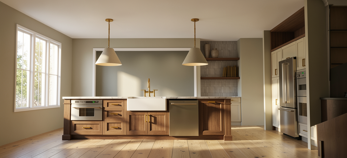 hyperrealistic interior architectural photography original composition preserved slightly elevated natural angle wooden floor scene with open book in foreground scattered books and pens partial rust colored textured armchair and black marble cylindrical side table focus priority on foreground open book wood floor nearby pen with maximum sharpness and micro detail midground slightly softer but still readable background gently softened but not heavily blurred maintaining full spatial readability deep but controlled depth of field not extreme bokeh architectural photography focus behavior warm golden hour sunlight entering from the side long diagonal shadows across the wooden floor soft volumetric light rays subtle haze in the air floating dust particles illuminated by sunlight enhanced material realism paper fibers worn book edges wood grain imperfections fabric texture marble veining natural tonal variation 50mm lens f2 8 f4 balanced depth of field high dynamic range global illumination physically based rendering ultra high detail subtle film grain no extreme blur no shallow portrait depth of field no cgi look no artificial lighting no object repositioning