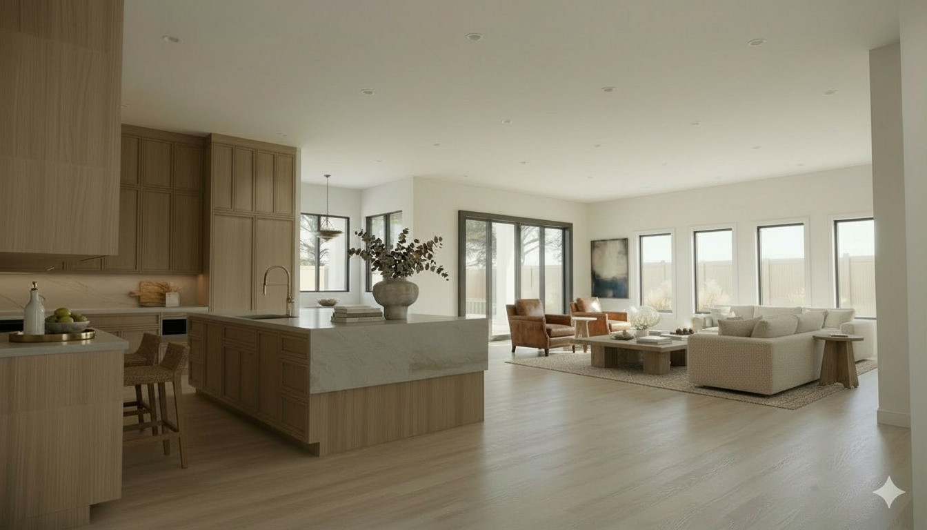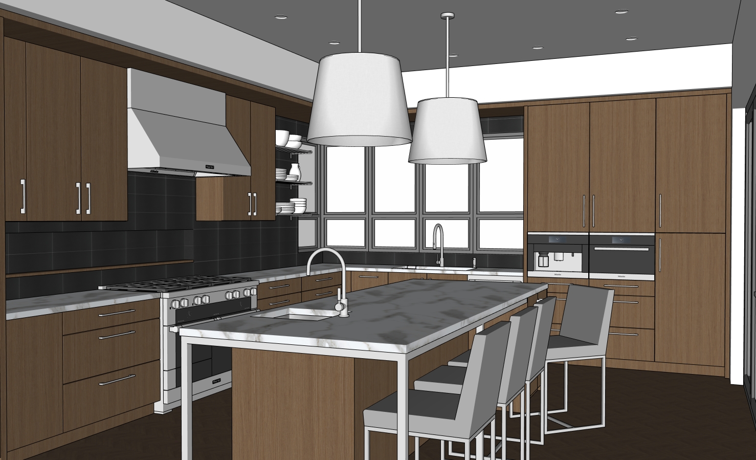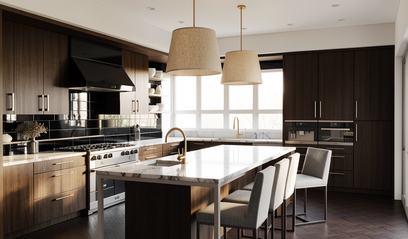 modern luxury kitchen interior warm contemporary design featuring flat panel black walnut cabinetry with rich natural grain minimal hardware using long linear pulls 10 brushed metal oversized waterfall island with soft gray veined marble countertop integrated seating with upholstered bar stools in neutral gray fabric back wall includes a professional gas range with custom hood surround glossy black elongated subway tile backsplash 4x16 stacked horizontal reflective finish and floating shelves with curated white ceramic dishware large window wall with divided light mullions soft natural daylight entering creating gentle contrast and reflections on polished surfaces island includes a sleek undermount sink with a high arc modern faucet in warm brushed gold finish two oversized linen drum pendant lights hang above the island softly diffusing light built in tall cabinetry wall with integrated appliances maintaining a seamless panel ready look flooring is dark stained wood matte finish adding depth and contrast to lighter surfaces style rendering direction photorealistic v ray style rendering global illumination soft shadows accurate material reflections slightly softened edges for a polished cg look balanced exposure warm neutral color grading subtle bloom on highlights realistic textures no over sharpening high dynamic range lighting camera angle at eye level 24 35mm lens feel depth and perspective emphasized clean composition focused on island and cabinetry