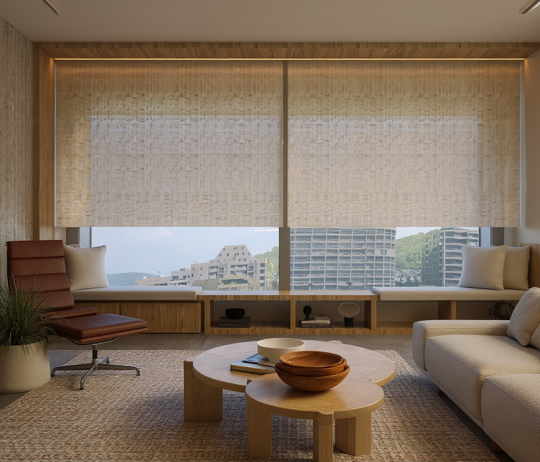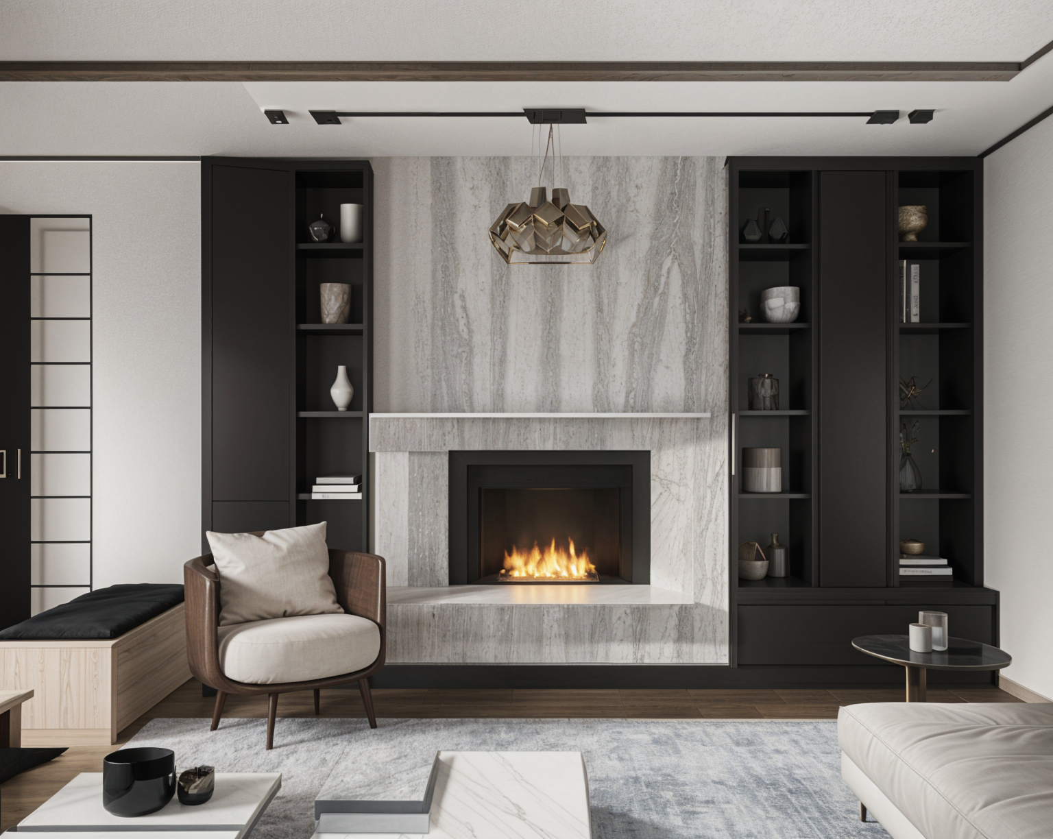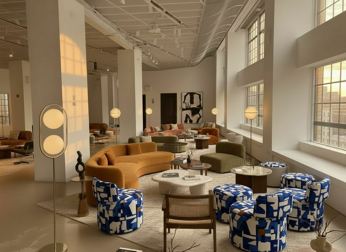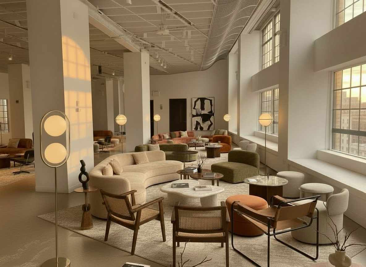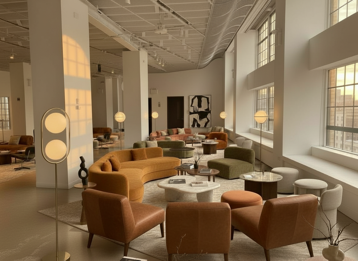 act as a top new york designer and elevate the color palette of the furnishings it should be neutral textural and incorporate black leather accents