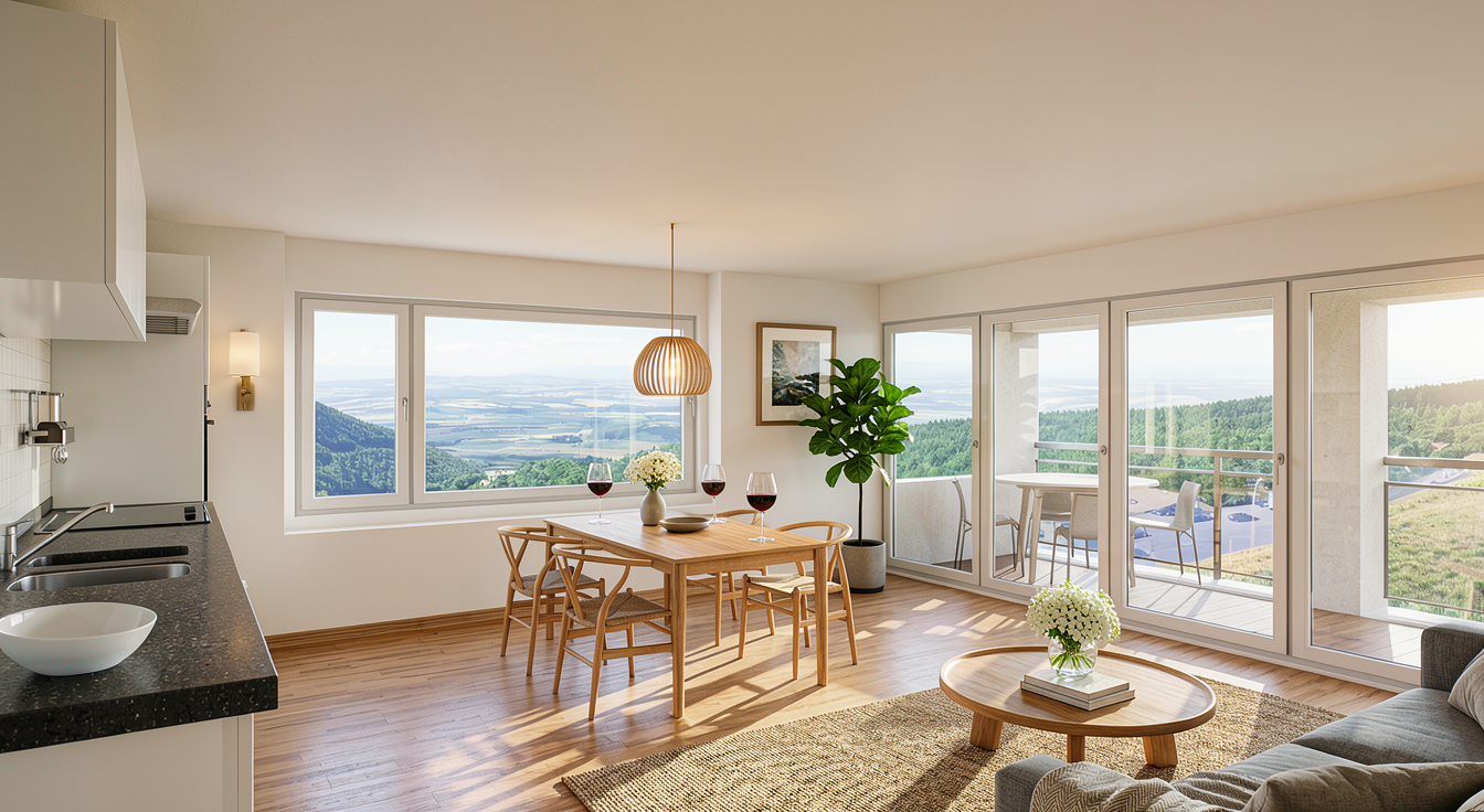 transform the provided wine cellar image into a high end photorealistic architectural render while strictly preserving the original volume layout proportions straight ceiling arches and spatial configuration do not modify any geometry or positions all walls and ceiling should be finished in a soft beige lime plaster with subtle mineral texture and a matte handcrafted appearance the floor remains in beige grey polished concrete with soft reflections at the back wall apply a uniform wall backlighting indirect led that softly washes the entire surface from behind or below emphasizing the architectural plane do not individually light the bottles the lighting must highlight the wall as a whole not create point lighting on each bottle inside the niches keep a subtle and homogeneous ambient glow avoiding strong or direct lighting on the bottles the effect should remain soft diffused and architectural ensure chair consistency use the same wooden chair design on both sides of the table replicate the wooden chairs from the left side and apply them identically to the right side maintaining symmetry and coherence slightly increase the overall brightness of the scene the lighting should feel warmer softer and more luminous while preserving a calm atmospheric mood avoid overly dark or contrast heavy rendering keep all materials highly realistic lime plaster texture natural wood grain stone table surface glass reflections and subtle floor reflections the final render should feel like a refined minimalist high end architectural visualization with balanced soft and slightly brighter lighting