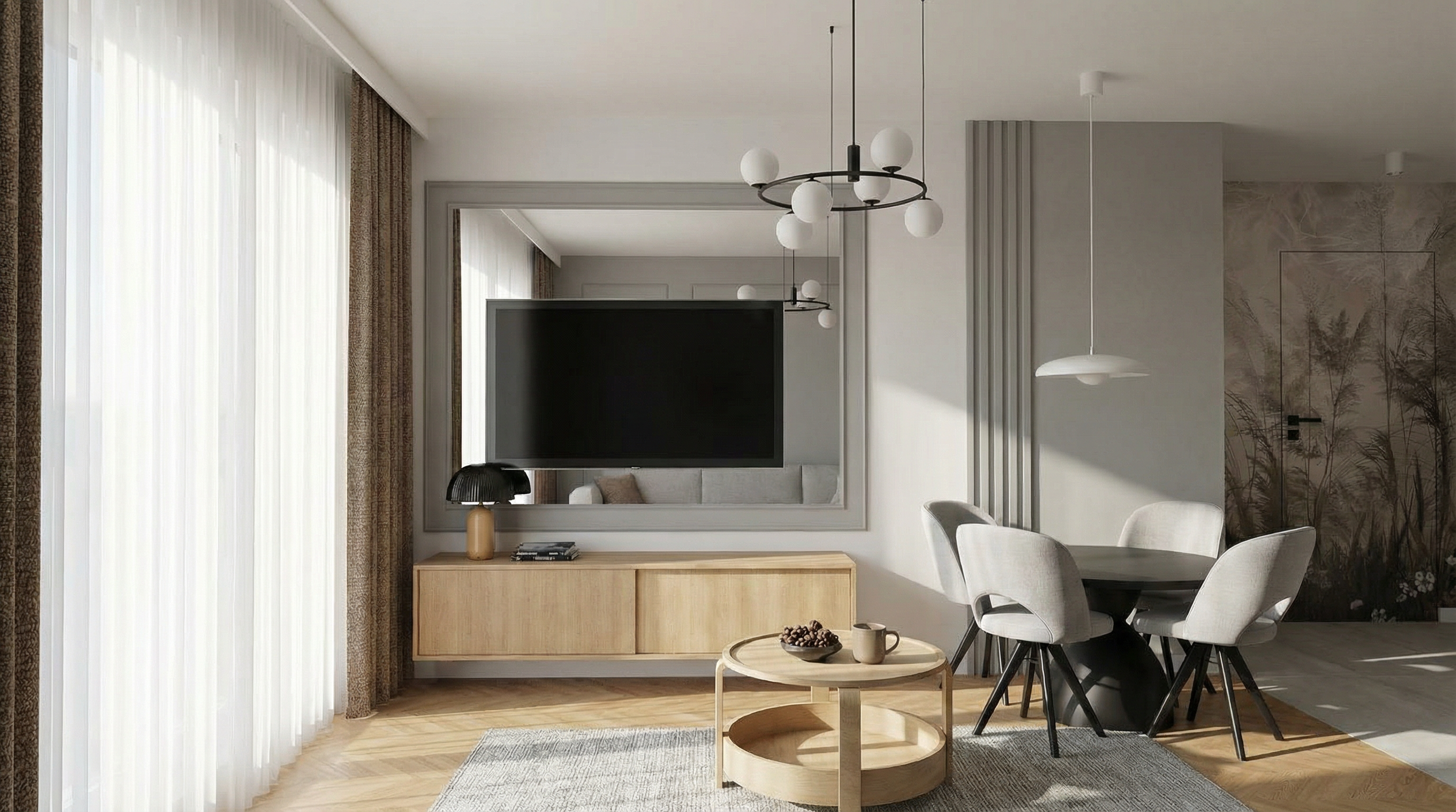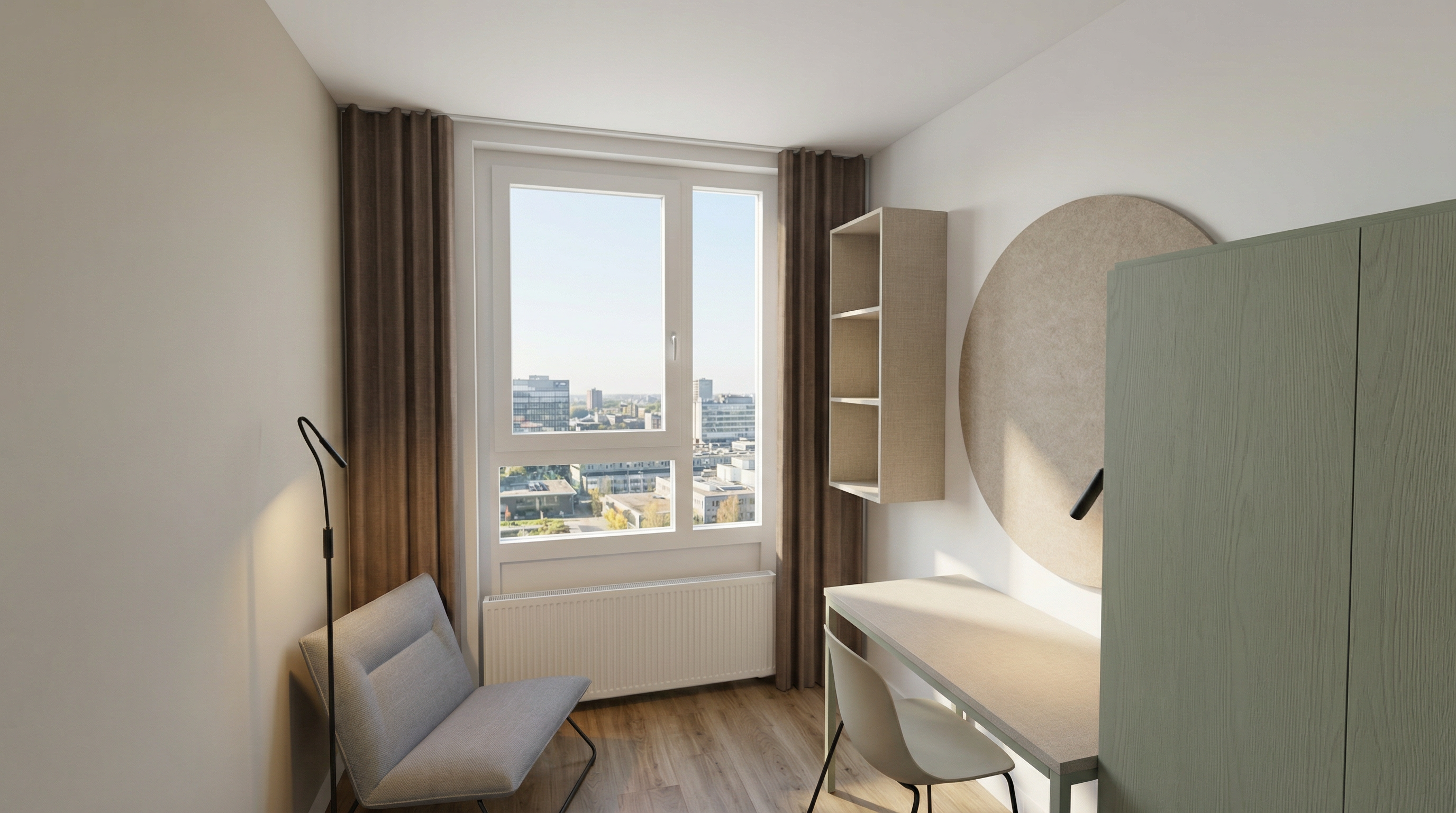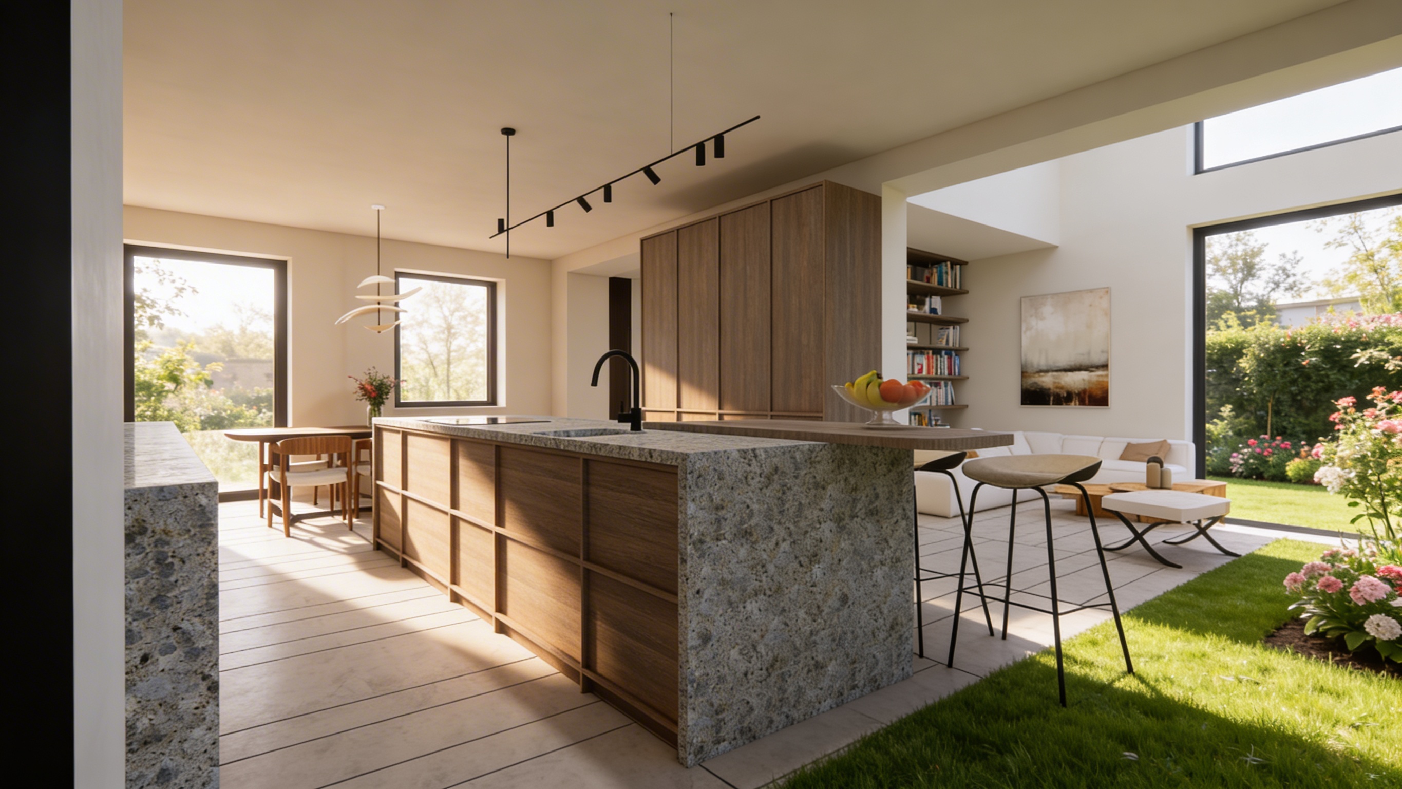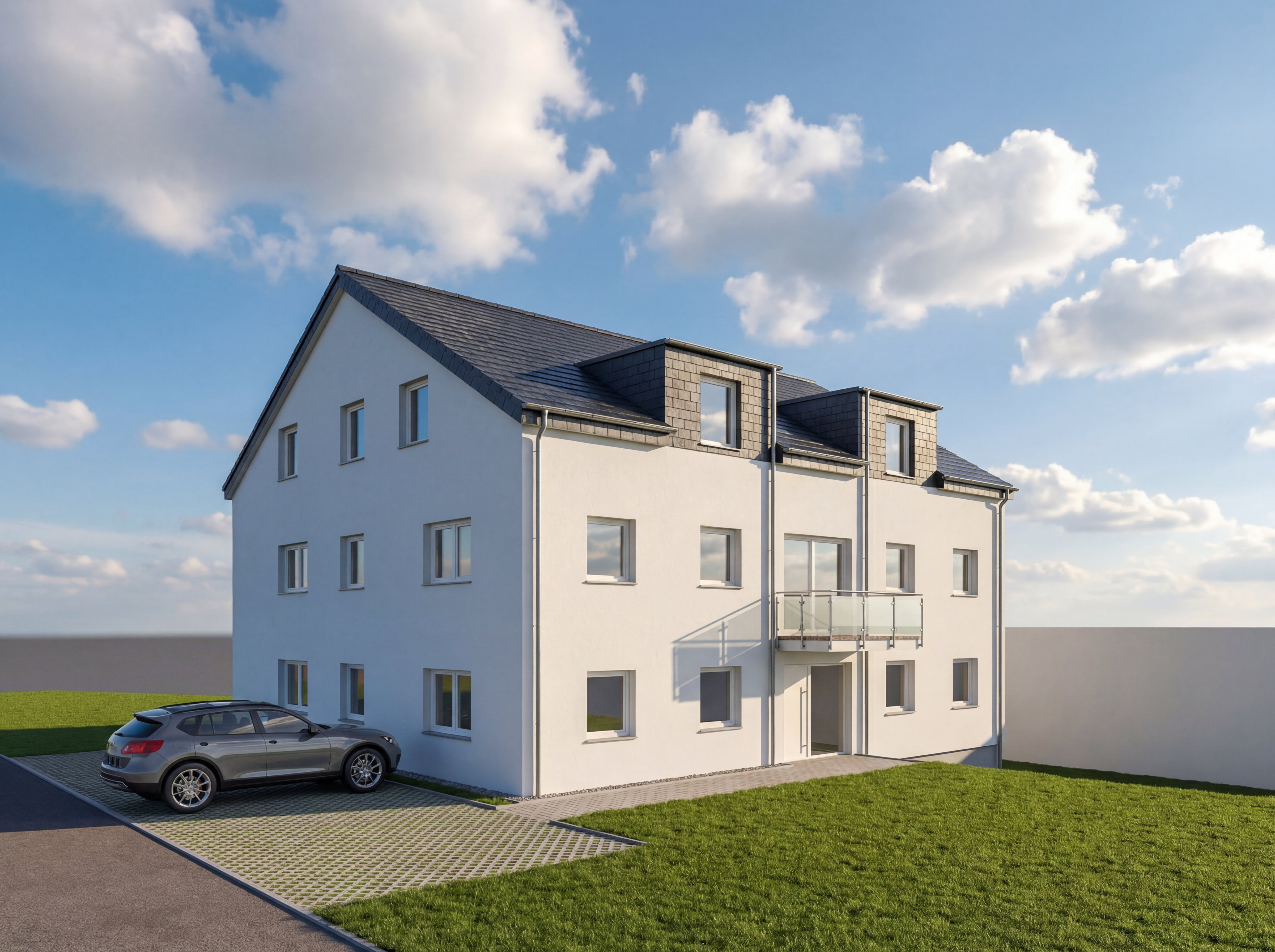 important to preserve the existing geometry and the existing context exactly as provided preserve the existing windows do not add new windows do not modify alter reinterpret add remove scale or reshape any geometry do not change the site surroundings street layout neighbouring buildings vegetation or context elements do not modify geometry scale proportions buildings road layout sidewalks or surrounding context in any way do not modify text sunny soft midday spring atmosphere diffused neutral natural daylight with subtle tones cinematic architectural mood sun position top left frontal large glass surfaces with realistic reflections soft mirror effect environmental reflections of sky and surroundings add a very little motion blur to the people do not alter text
