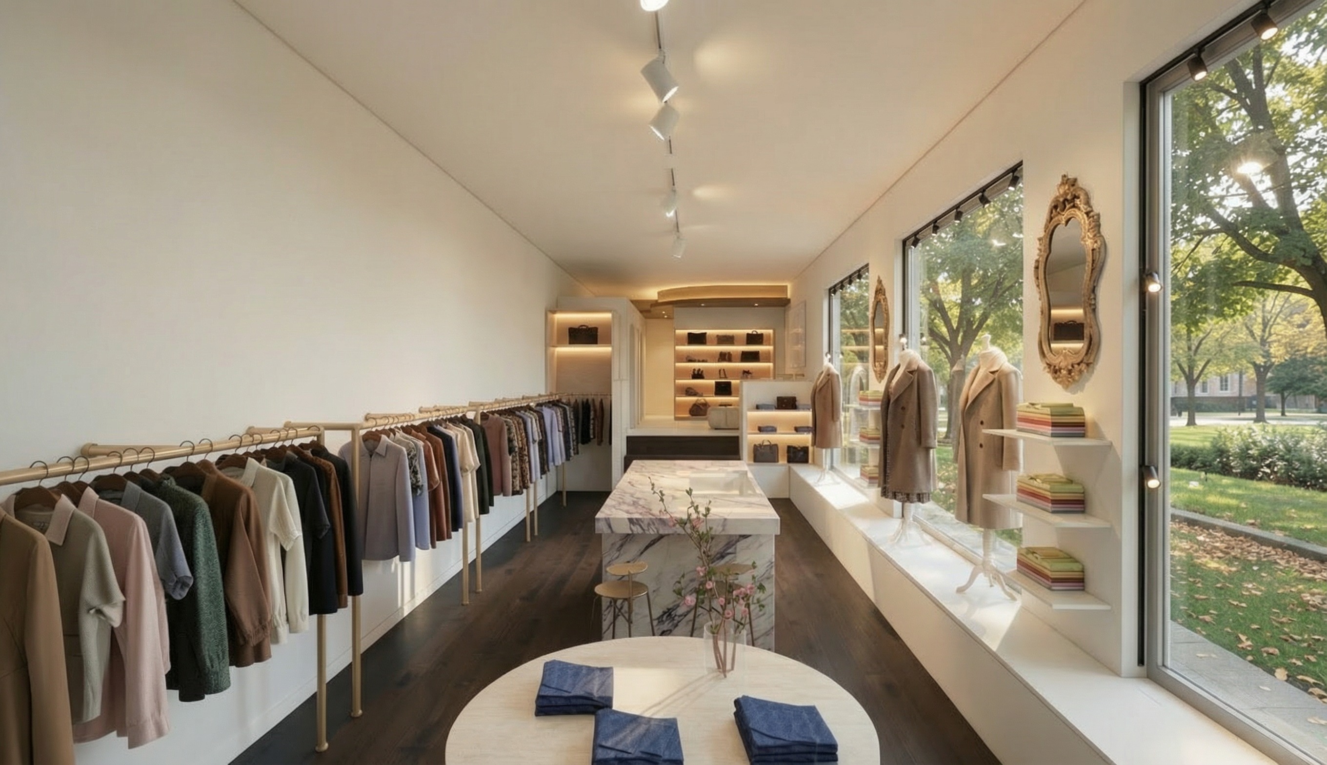 please make the brass clothing rails be a more aged darker brass finish make womens clothing hanging up look more feminine and expensive make flowers on table look more real and lush