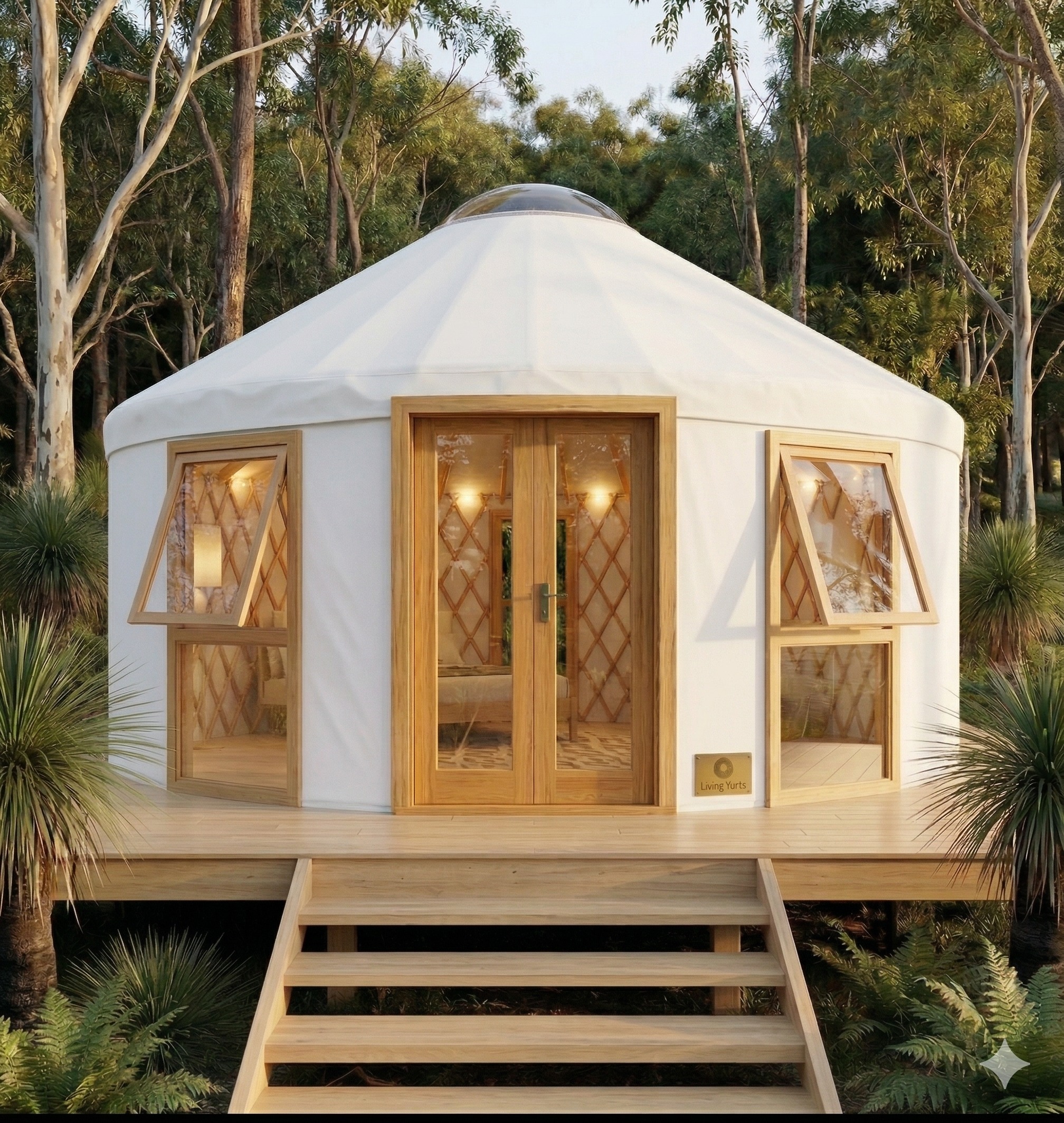 use the same yurt but delete the double door and create this window door configuration instead from left to right 1 timber awning window like in the render above 800mm wide 2 fixed panel exactually like the timber window but just a full glass panel 800mm wide 3 single door opening inward 800mm wide full glass panel 4 timber awning window the same as no 1 all the windows and doors are togeather connected