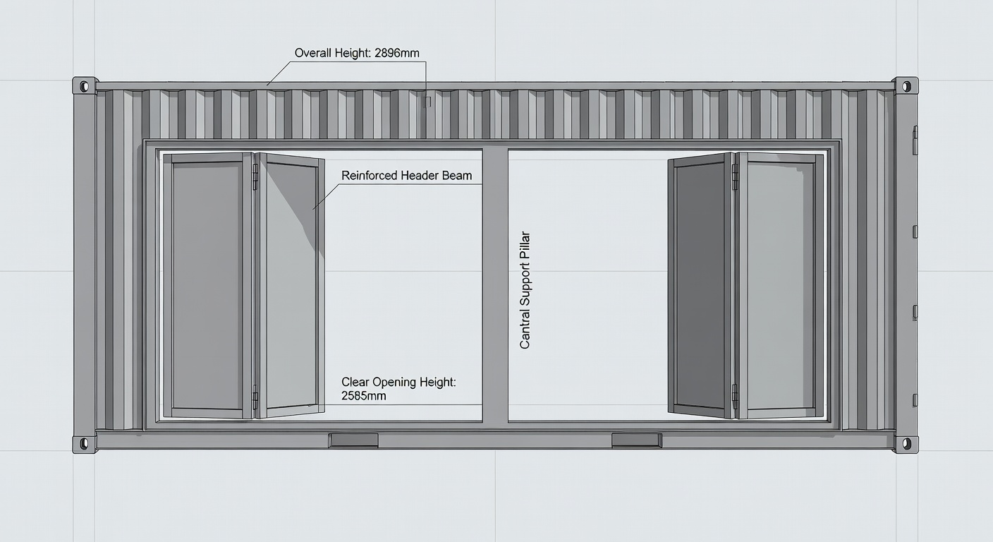 zaha hadid exterior shot create a realistic image of a high cube iso shipping container with two bifold door and separate by a center post architecture