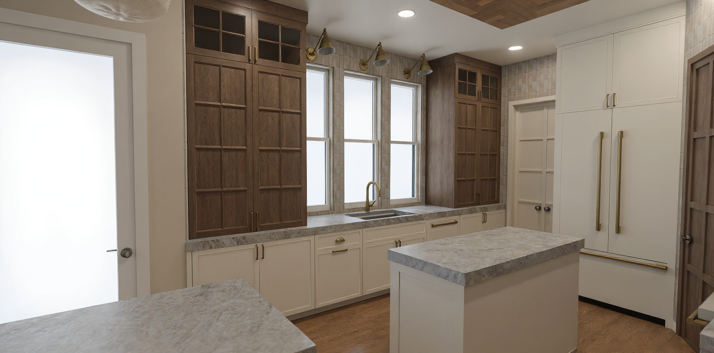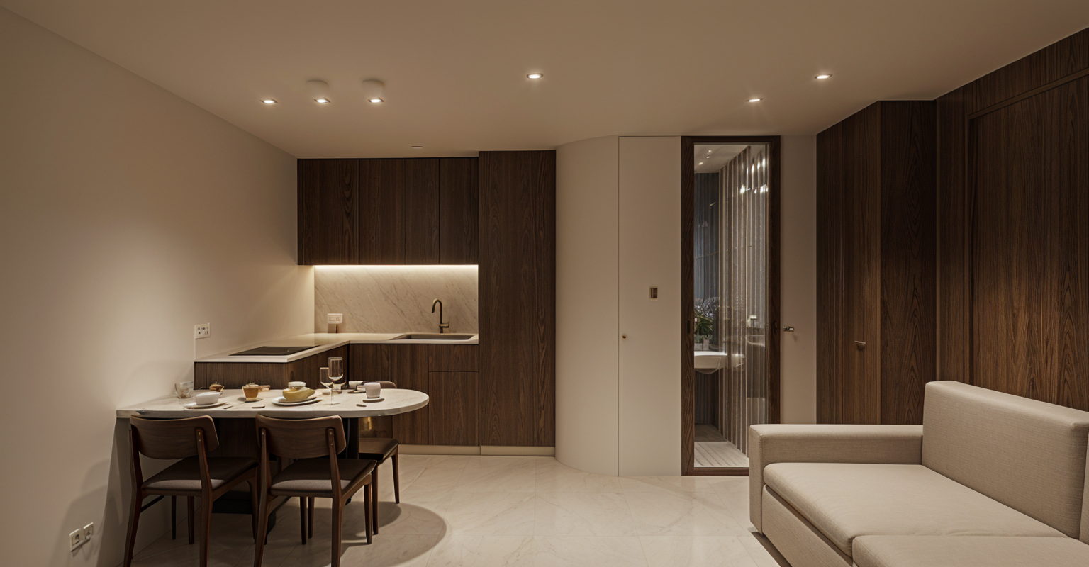 top view of a ceramic store with one dj booth blue curtains on the sides marble central table stainless steel round displays display shelves on the back wall