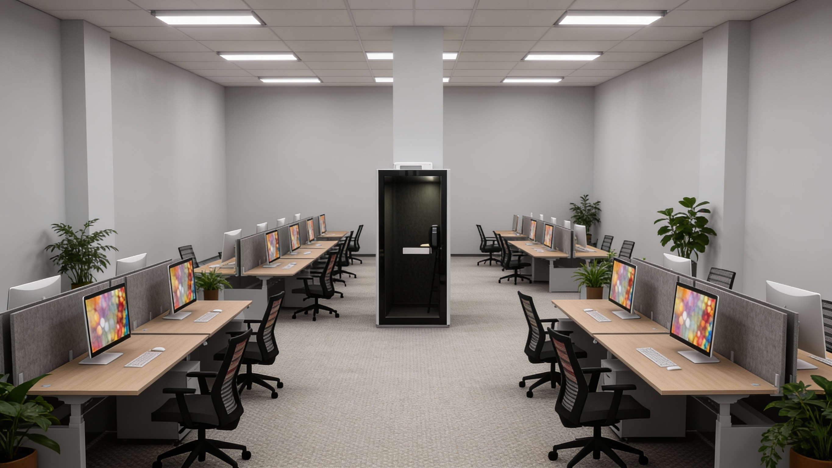 quiero que el rodapie sea gris y quiero que la iluminacion sea calida no tan calida entre la actual y blanca
