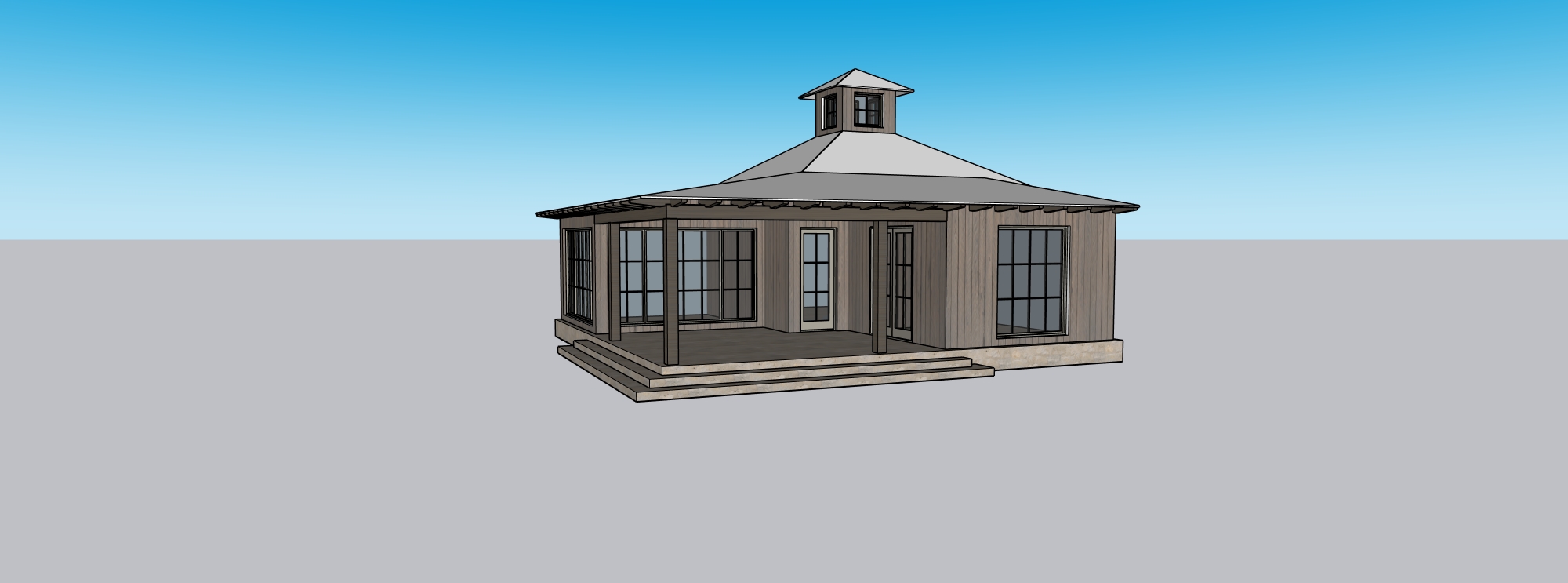 oak wood siding rusted corrugated roof texas hill country lush landscape add outdoor furniture on porch