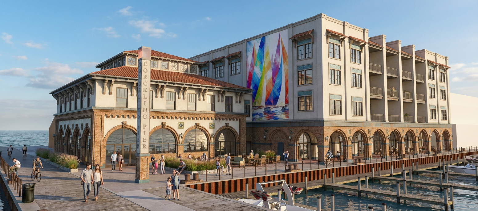 clearly define the architectural style materials and textures emphasizing natural stone walls with warm earthy tones sleek modern design and elegant white pillars supporting a minimalist overhang preserve and emphasize the exact logo text vista amboro resturante no spelling changes placed on the stone wall with a subtle hidden backlight creating a soft halo glow behind the lettering describe composition and camera perspective eye level slightly wide angle view cinematic framing with the entrance as the focal point and natural depth leading through the walkway include environmental richness lush green foliage landscaped garden and vibrant purple blossoms surrounding the entrance under a clear blue sky add human presence high class elegantly dressed guests entering the restaurant captured mid motion conveying exclusivity and liveliness specify lighting natural daylight soft shadows cast by the overhang and pillars gentle highlights enhancing textures and greenery