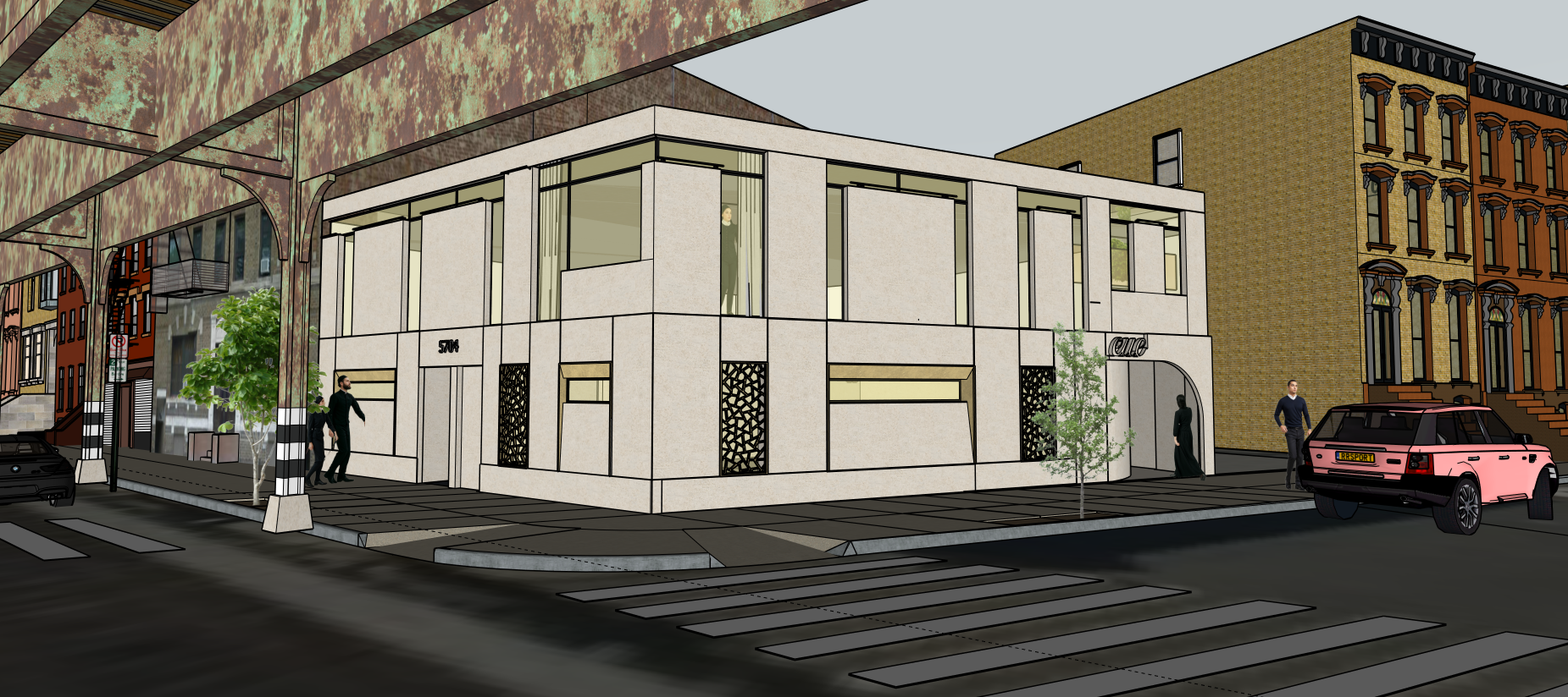 contemporary two story fa ade with smooth concrete panels in a pronounced grain texture bronze metal accents and elegant bronze lattice details large glass windows reveal a warm well lit interior urban brooklyn street under an elevated train line cinematic dusk atmosphere around 5 pm ultra photorealistic architectural render