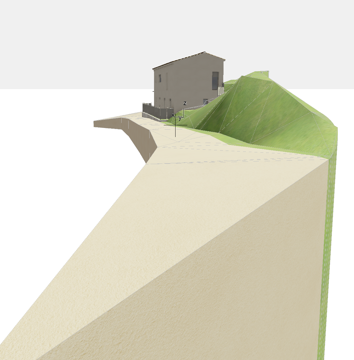 there are some mediterranean pine trees in the right background tree shadows on the facade fences and windows are ral 7030 there is a cypress tree on the right at the left of the image there is houses and mediterranean pine trees some lavender on the right the path is in gravels no wall on the left and on the left do not change the point of view at the left of the path there are plants
