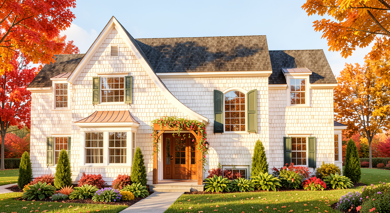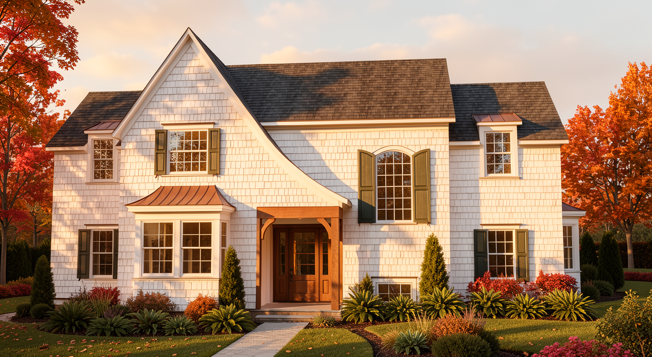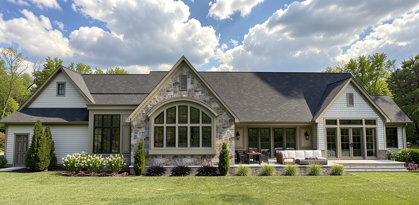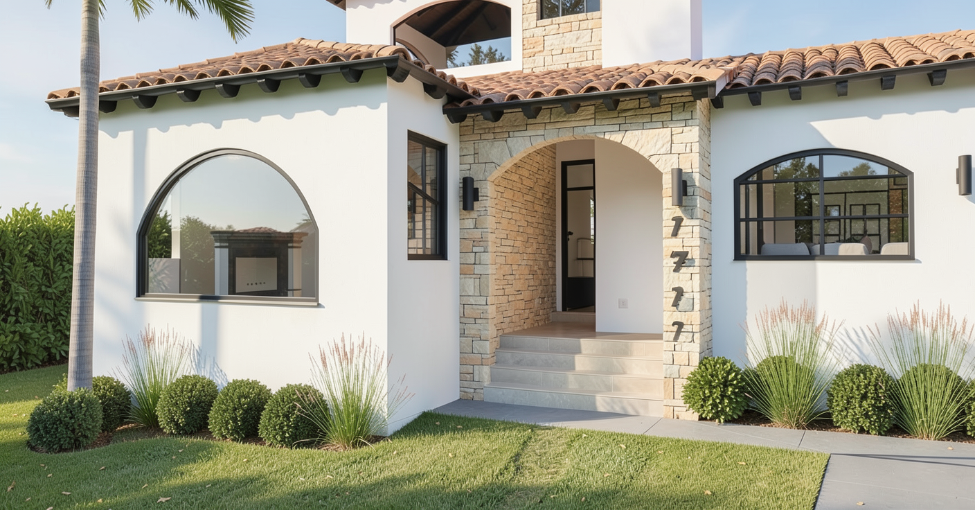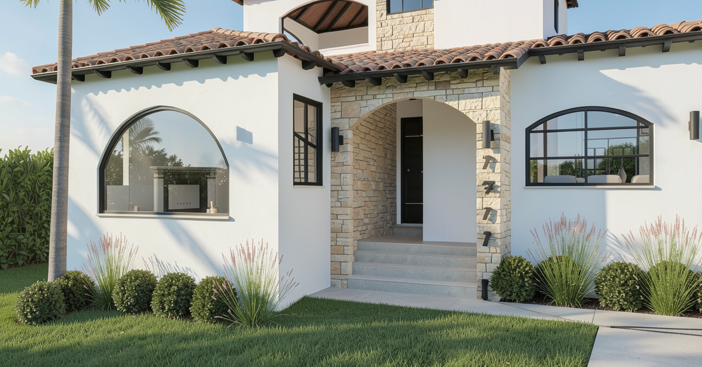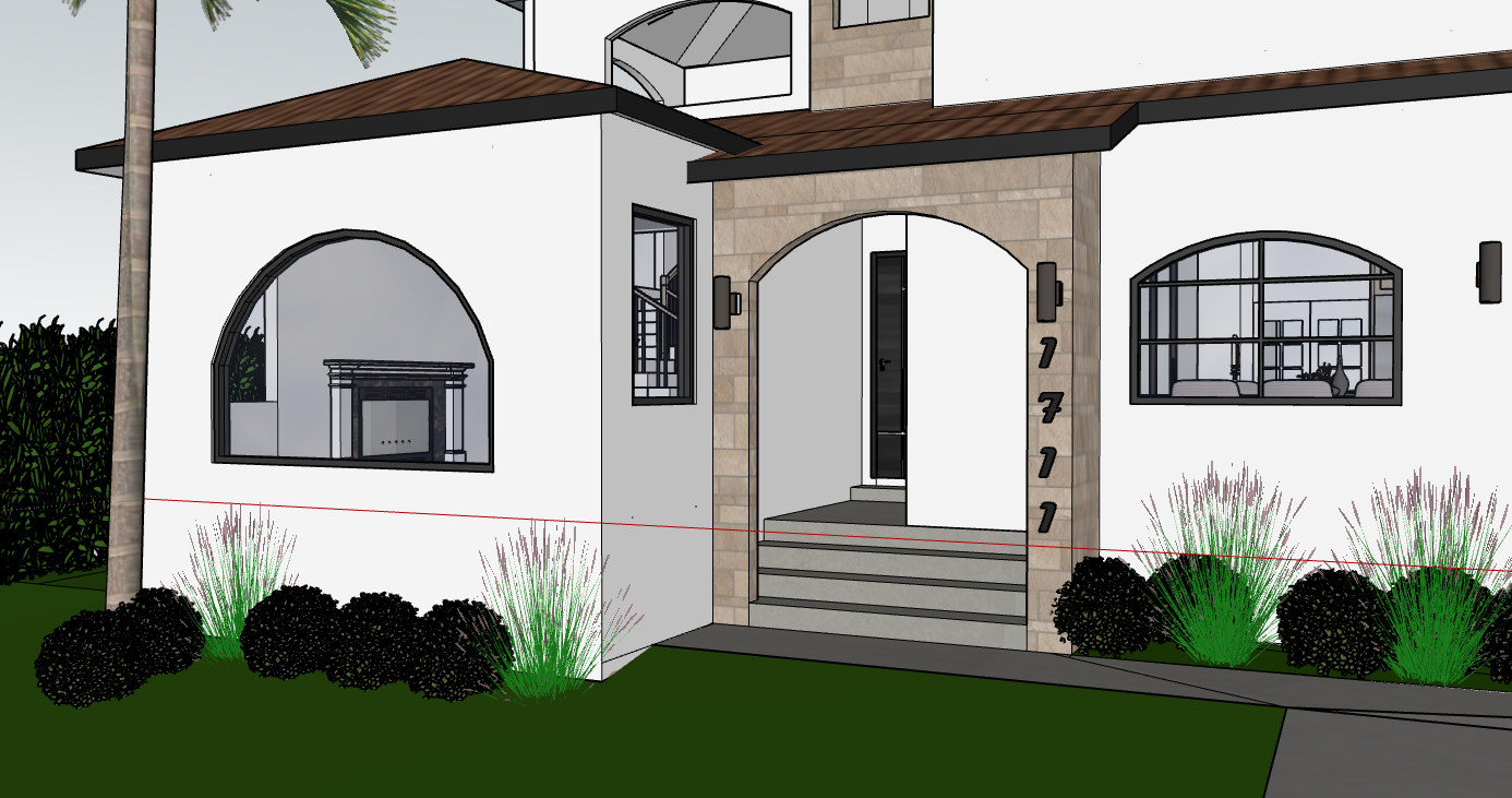 make the house white middle section light color stone veneer all window and doors black frames under eave black beams spanish clay roof add house around
