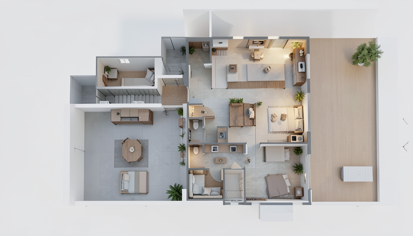 set in forest of primarily deciduous trees with the hillside sloping up behind the house and down away from the sides