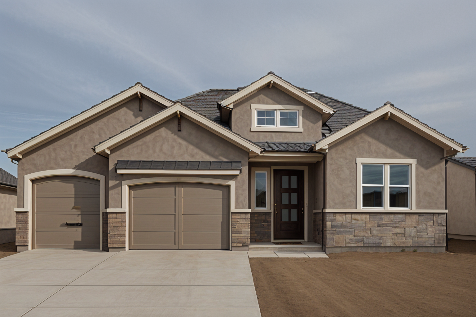exterior shot white exterior with white trim white stone black front door black windows on front black metal roof green gras bushes flowers and trees in background architecture