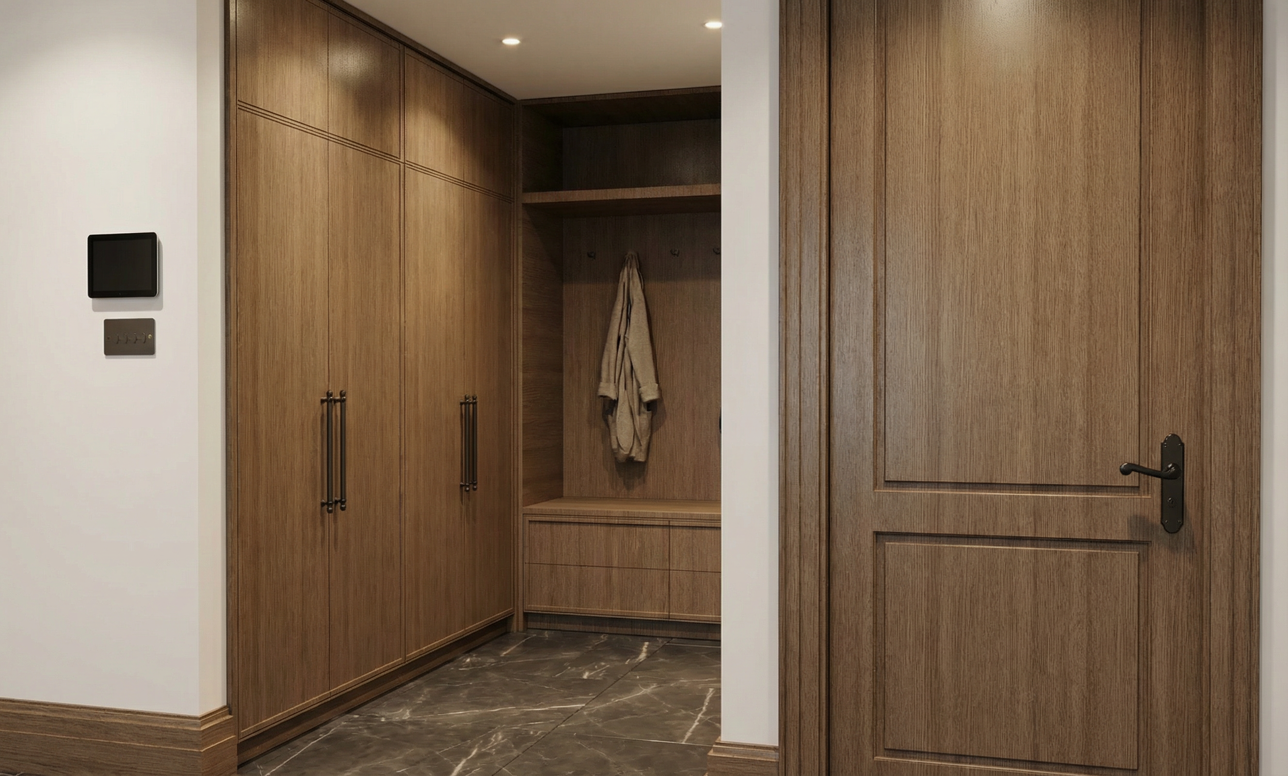 make cabinet doors solid off white with grey undertone high gloss colour ultra photo realistic rendering please make lines around the doors realistic