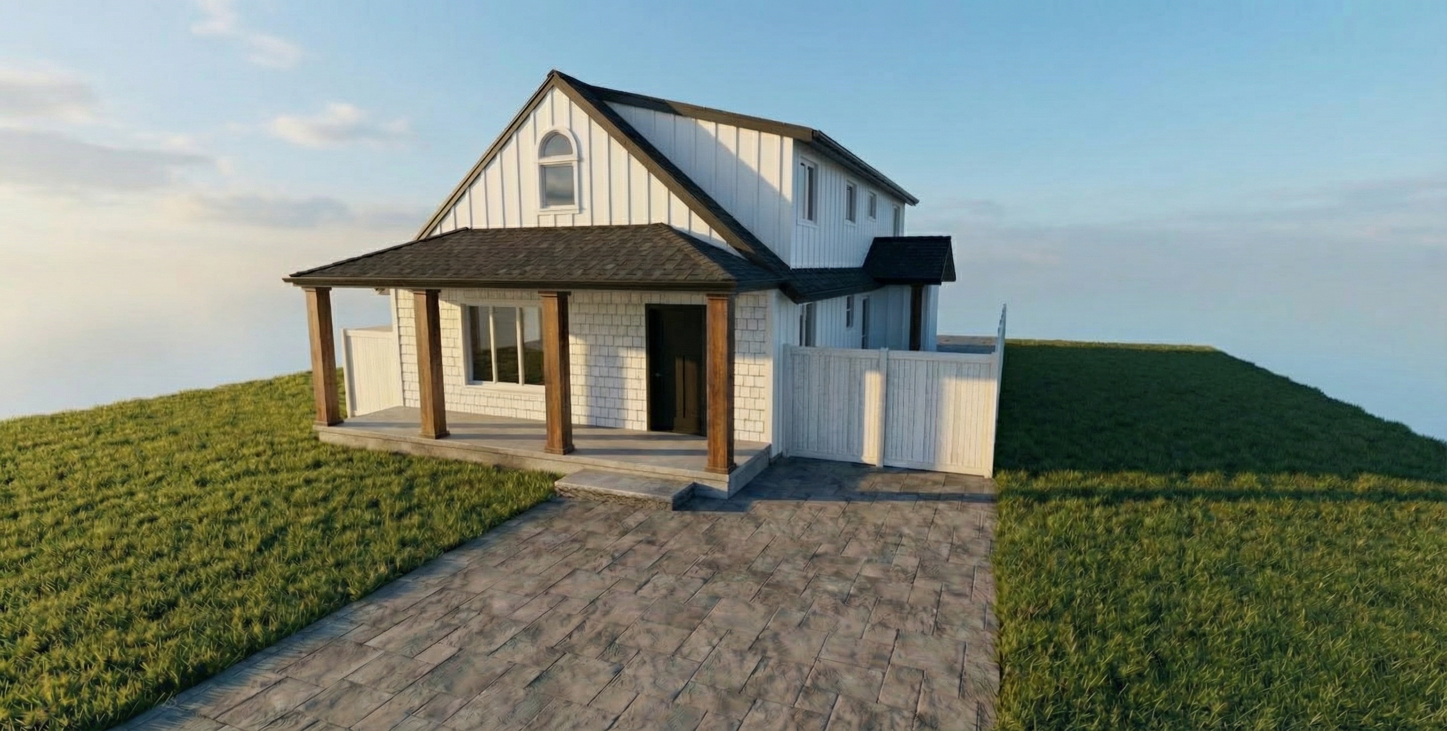 match the porch floor finish to the driveway fence is solid white vinyl