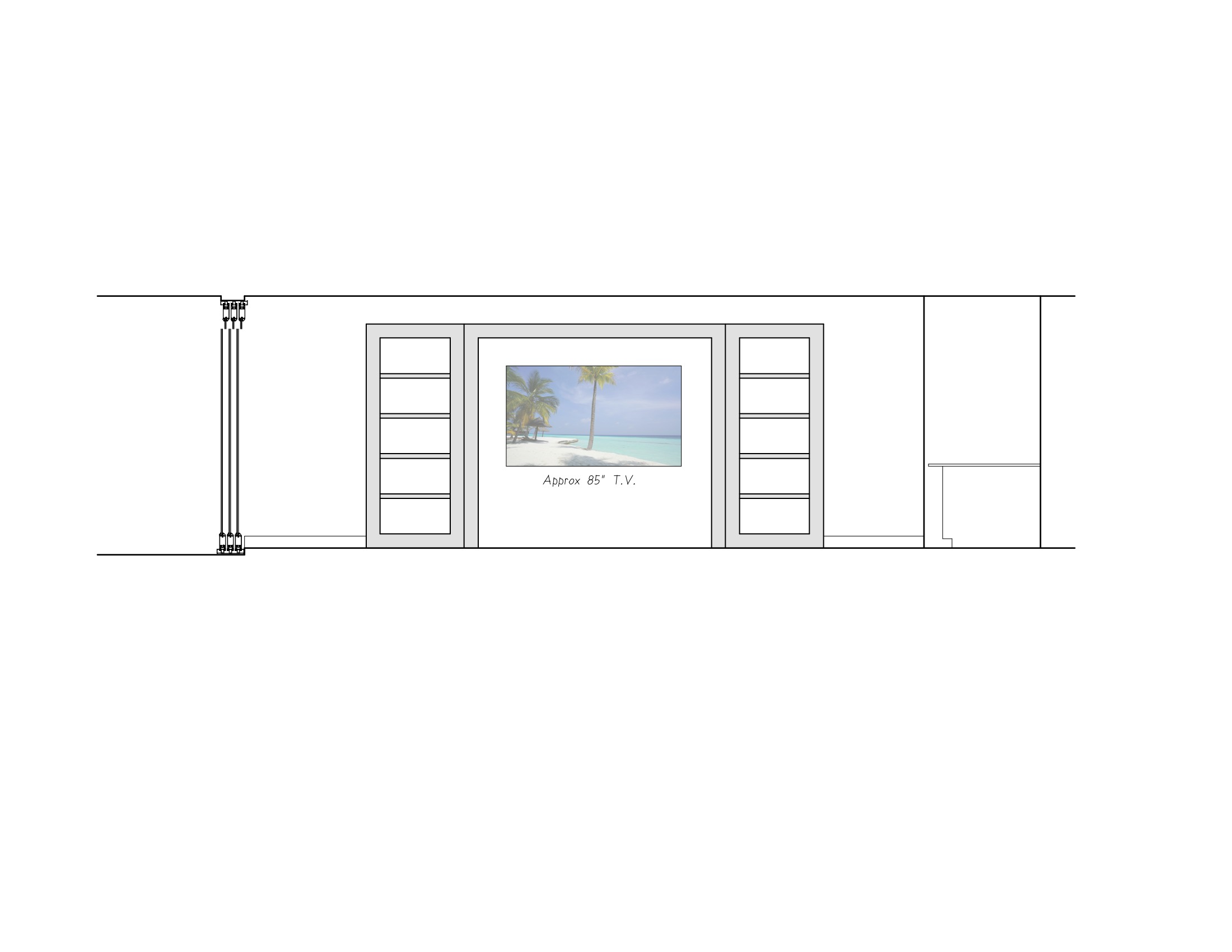 bronze wood entertainment center white walls large tile floor