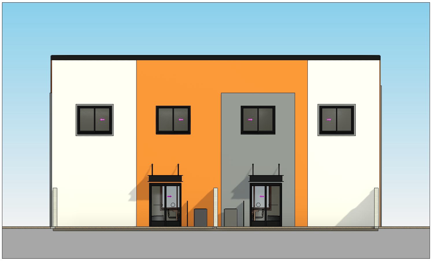 create a render in hyper realistic architectural visualization quality 8k resolution all objects and architectural features must remain in place do not add any objects or delete anything from the image the spatial configuration must remain unchanged warmth gentle image with soft shadows enhanced color richness and luxurious level realism improve depth and realism and polished clarity while keeping the entire scene exactly as originally designed soft white stucco walls with 2 orange stucco bump out and 4 grey stucco bump out soft blue sky