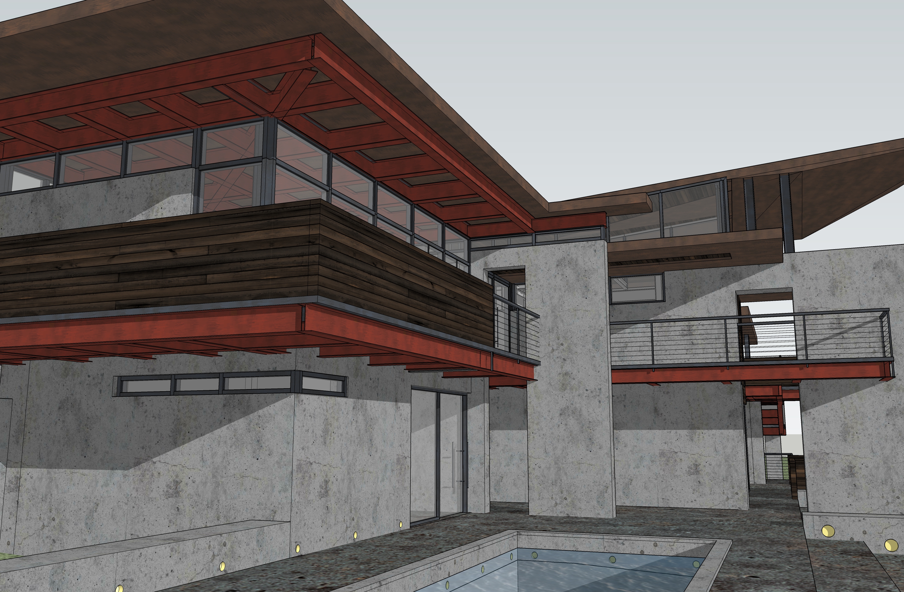 dark wood shiplap siding with corten panels concrete accent walls sunlight on building face dusk fog