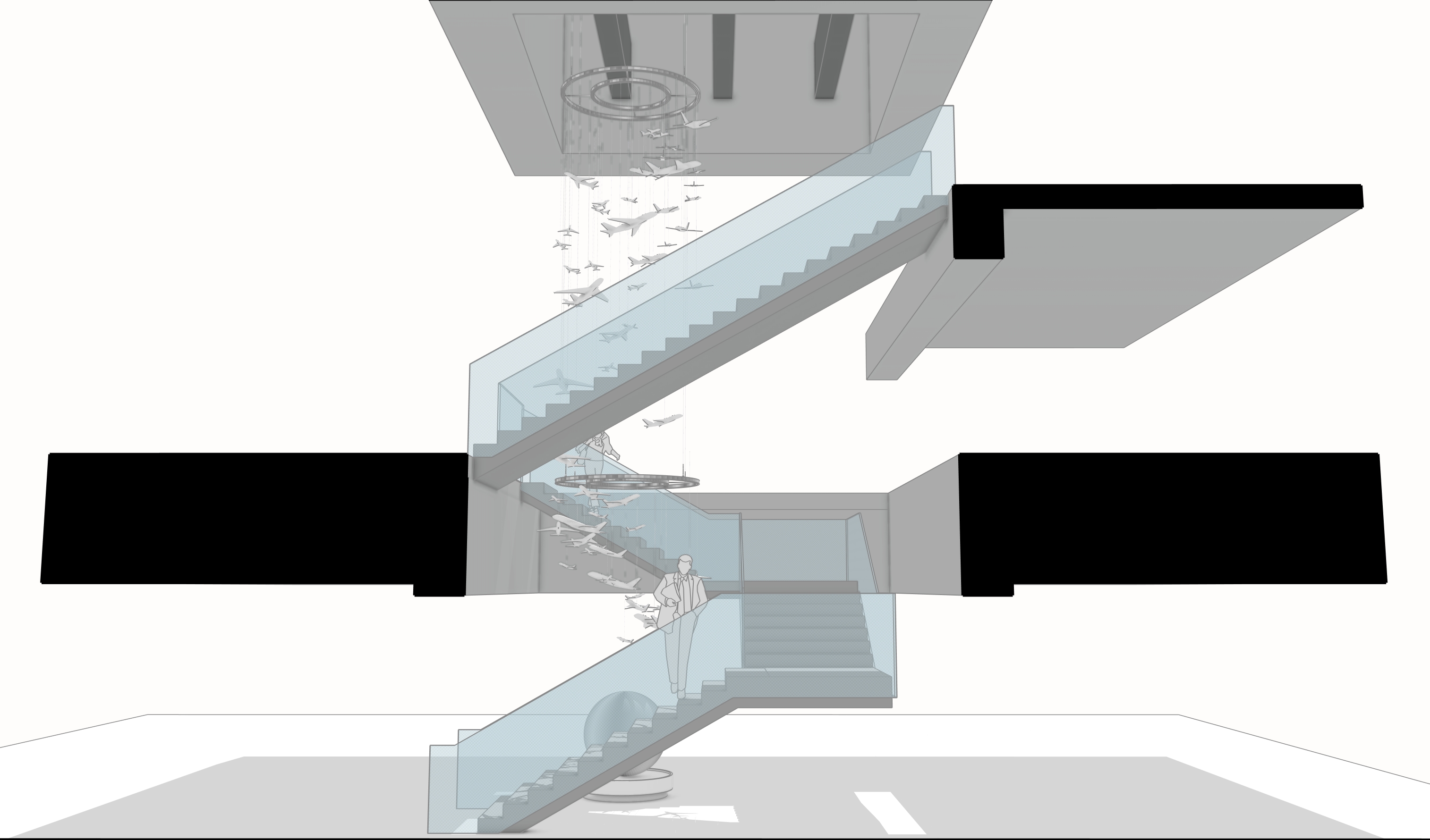 showcase the hanging mobile of airplanes in the rendering and add some sheen to the glass railing on the staircase add shadow and some sort of background that suggest this is in an airport architecture