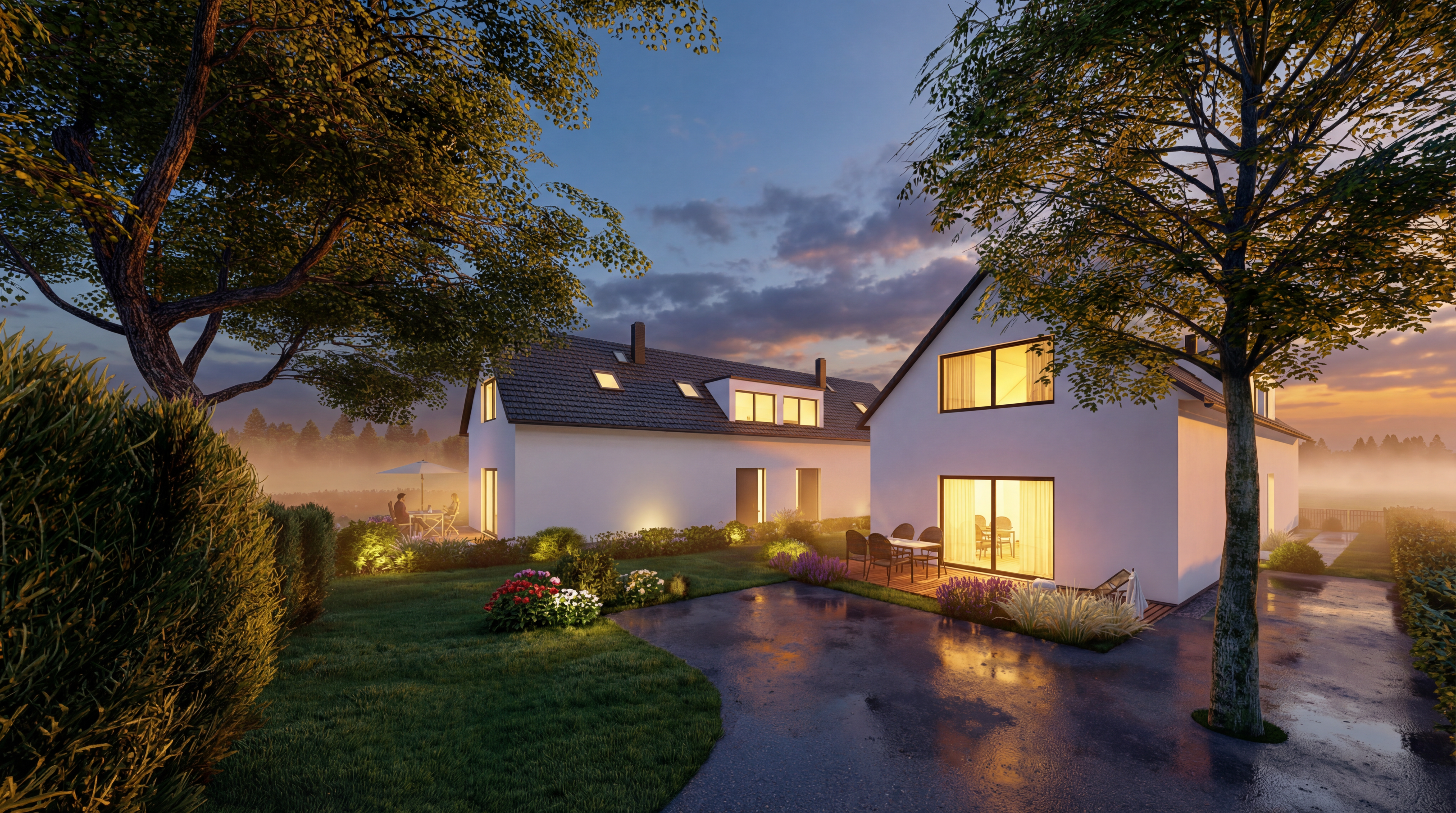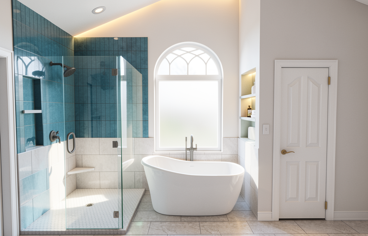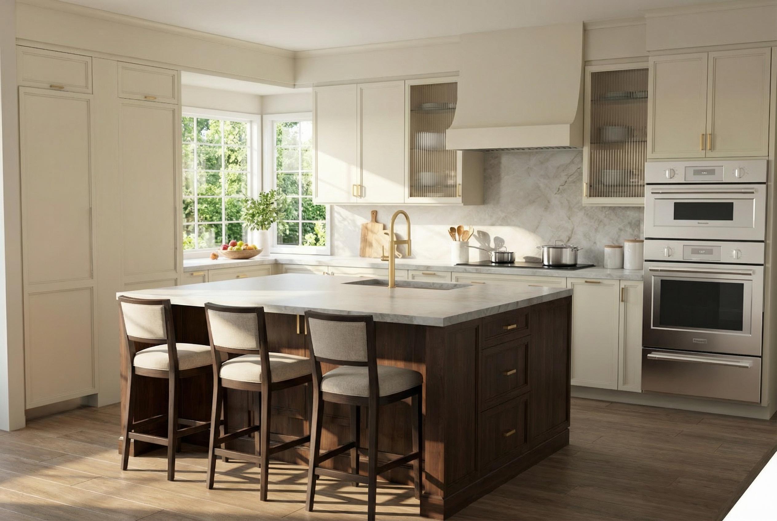 create a photorealistic rendering of the existing kitchen while keeping the layout camera angle and lighting exactly the same do not alter the lighting conditions change all cabinetry to a muted gray green color with a matte painted finish no gloss or reflections maintain the existing cabinet style proportions and details update only the tall cabinet doors the long vertical cabinets to have fluted glass panels with vertical ribbing and subtle distortion keep the upper cabinets unchanged do not apply fluted glass to the top cabinets replace the round window on the left side behind the cabinetry with an arched window the new window should have a black frame with divided panes and a soft arched top remove the circular shape completely and maintain proper scale and proportion to the wall change the island countertop to a 1 5 inch thick walnut butcher block with a natural wood grain and a soft matte finish ensure realistic texture and proper scale maintain all other materials and elements as shown using high end realistic textures and soft shadows