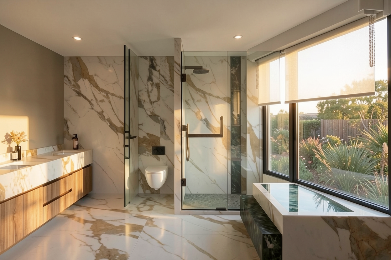 render a modern living room with a cozy and elegant atmosphere the walls are a soft neutral beige the large windows fill the room with bright natural light and showcase a clear blue sky the modular shelving unit on the left is sleek and black holding artistic vases and sculptures center the room with a plush tufted sofa in textured light brown fabric add vibrant green indoor plants in stylish brown pots the flooring is a warm medium toned wood enhancing the inviting feel of the space
