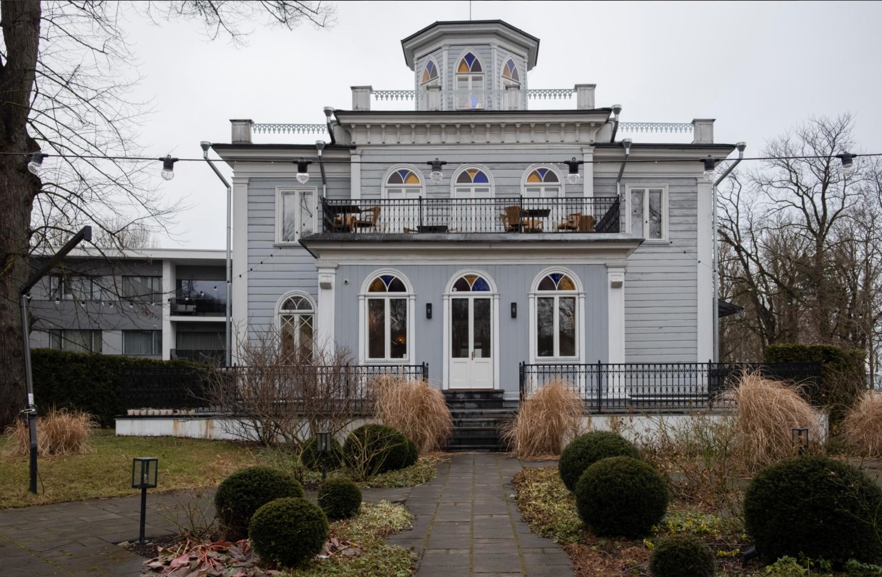 930s feel in moscow remove the building in background wilder evergreens in front of the house remove modern lights and round shrubs
