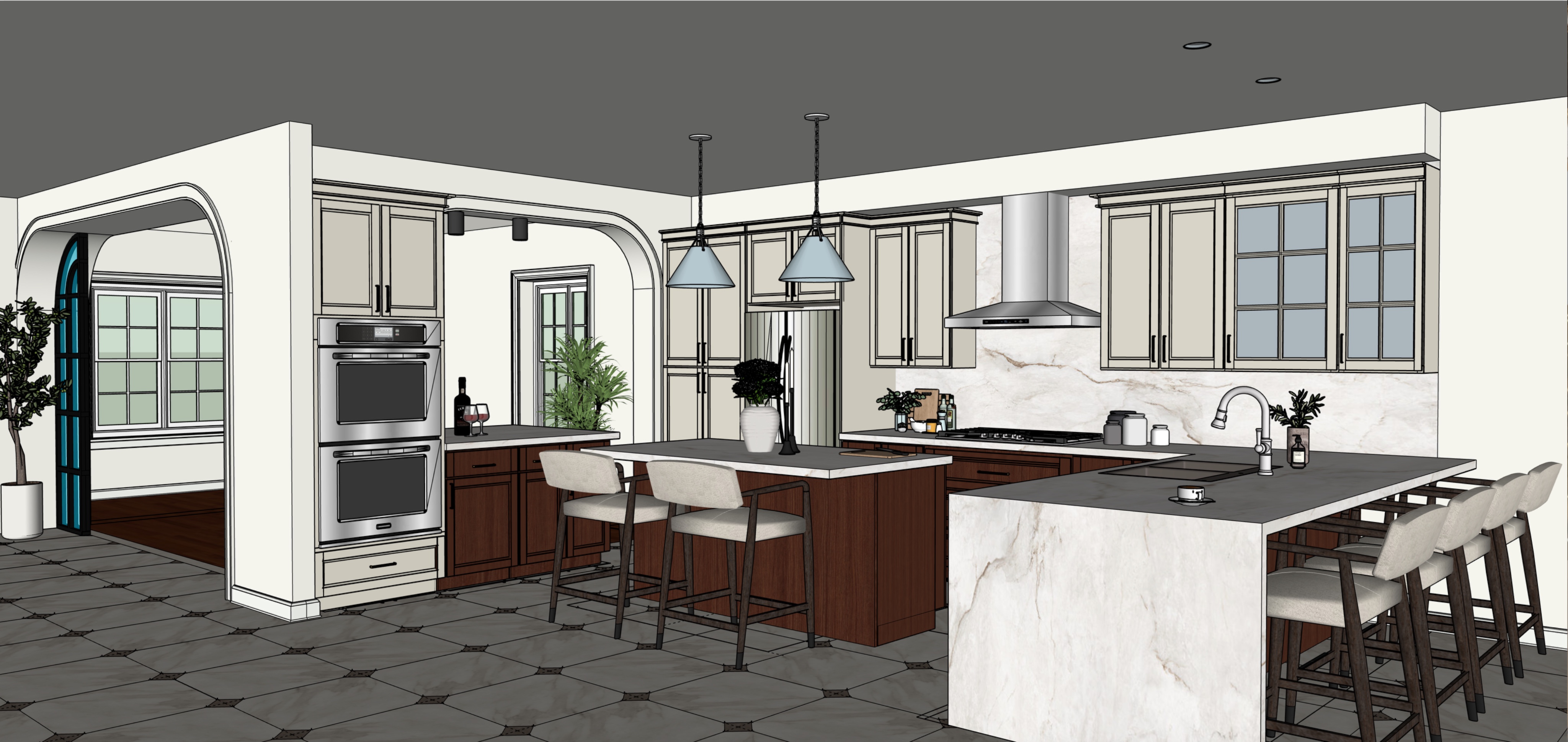 create a photorealistic rendering of the uploaded sketchup interior model preserve the exact layout geometry and proportions of all elements cabinets island windows walls and doors do not change materials colors finishes or textures use soft natural daylight coming through the windows supplemented by subtle artificial lighting under cabinets and above materials should appear tactile and realistic cherry wood grain cream painted cabinets baby blue pendants with chrome hardware quartz countertops eggshell walls marble floors and fabric textures include realistic reflections and shadows space should feel warm calm minimal and uncluttered camera angle at human eye level composed like professional interior photography high quality architectural visualization no redesign of geometry or materials