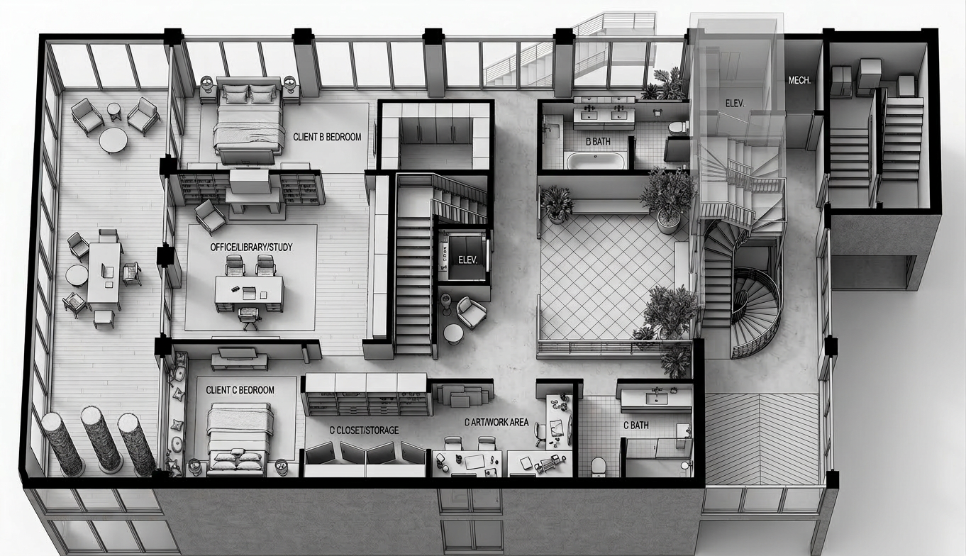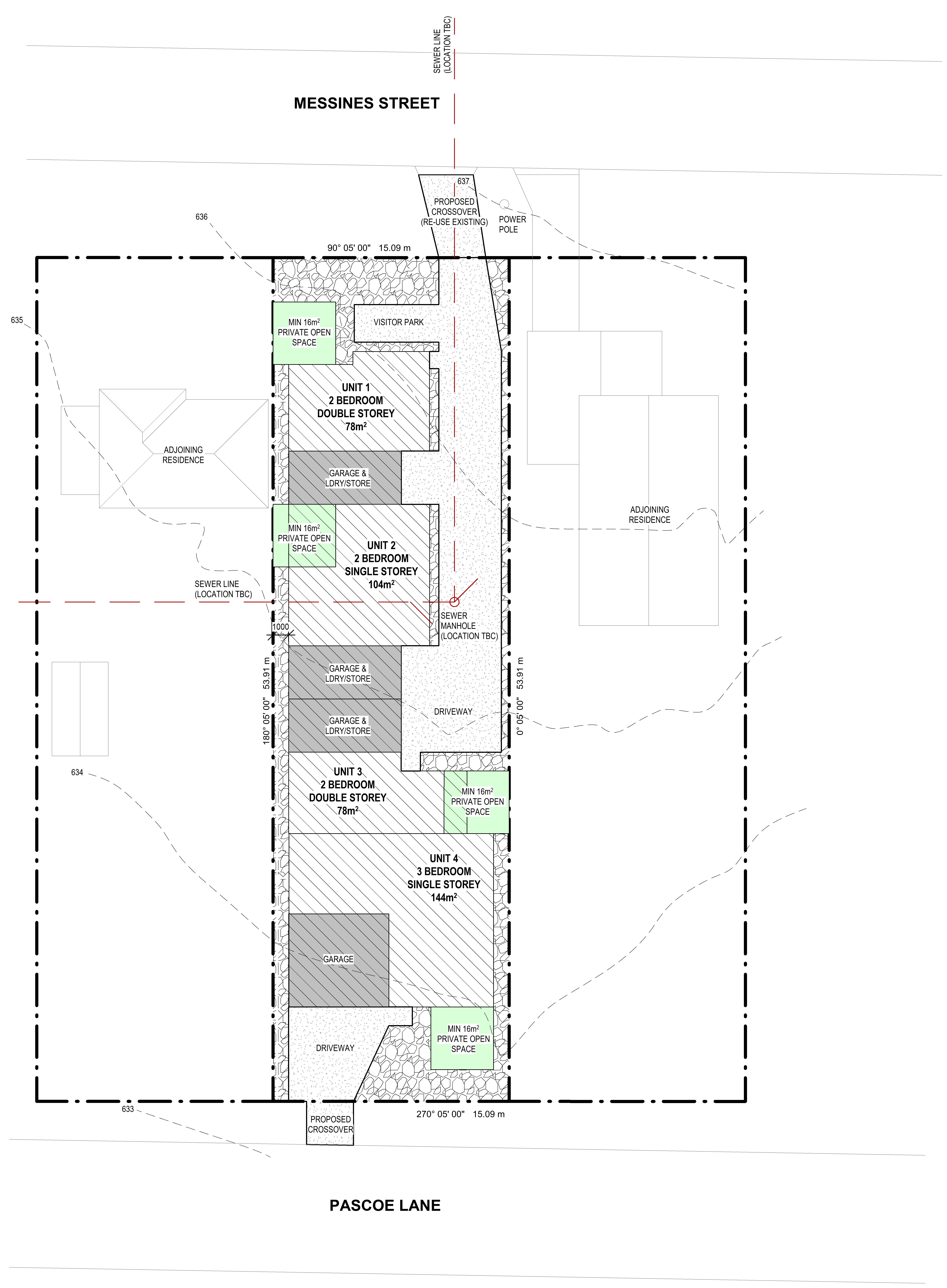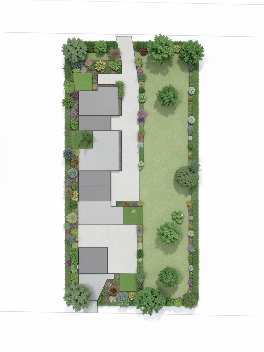 professional architectural site plan render strict top down 2d view maintain exact site boundaries dimensions building footprints driveway alignment and crossover locations unchanged replace all pebble hatch areas only with high quality landscaping including green lawn defined garden beds low maintenance shrubs and a small number of well spaced feature trees trees should be appropriately scaled for a residential development small to medium canopy not oversized add landscaping specifically near visitor parking to soften hard surfaces along driveway edges without obstructing vehicle access keep driveway and vehicle circulation areas clear and fully readable do not place trees or plants within drive paths or on the green hatch zones use realistic but subtle materials light grey concrete for driveway muted green lawn natural garden bed tones and soft organic planting shapes apply clean professional developer style graphics with no shadows under trees and slight texture variation ensure the drawing remains crisp legible and suitable for client presentation do not change building shapes sizes or positions do not move or alter driveways crossovers or parking layout do not add extra structures no perspective or 3d angles no people cars or furniture do not blur or modify text do not overscale trees or overcrowd planting avoid dense forest like landscaping