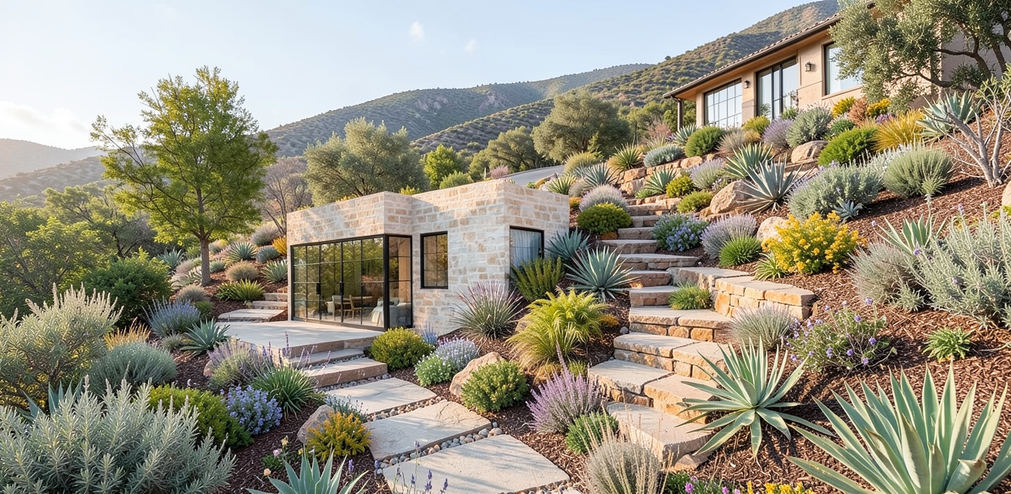 pathway and stairs up the hill meandering with planting natural shurb road behind house