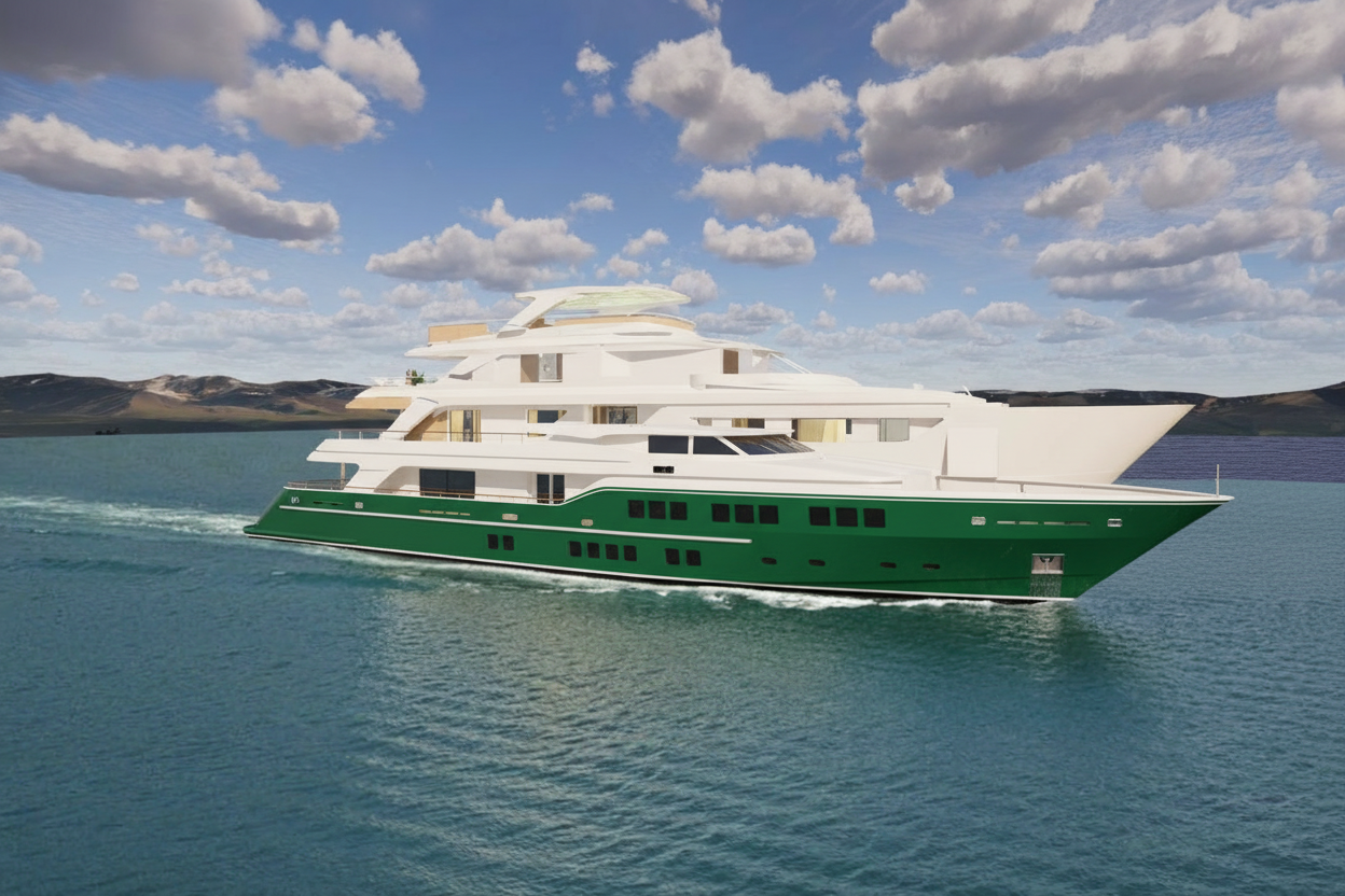 edit the exterior of the yacht to have a dark green on the lower half covering up to the bow like the reference image keep it minimal and clean